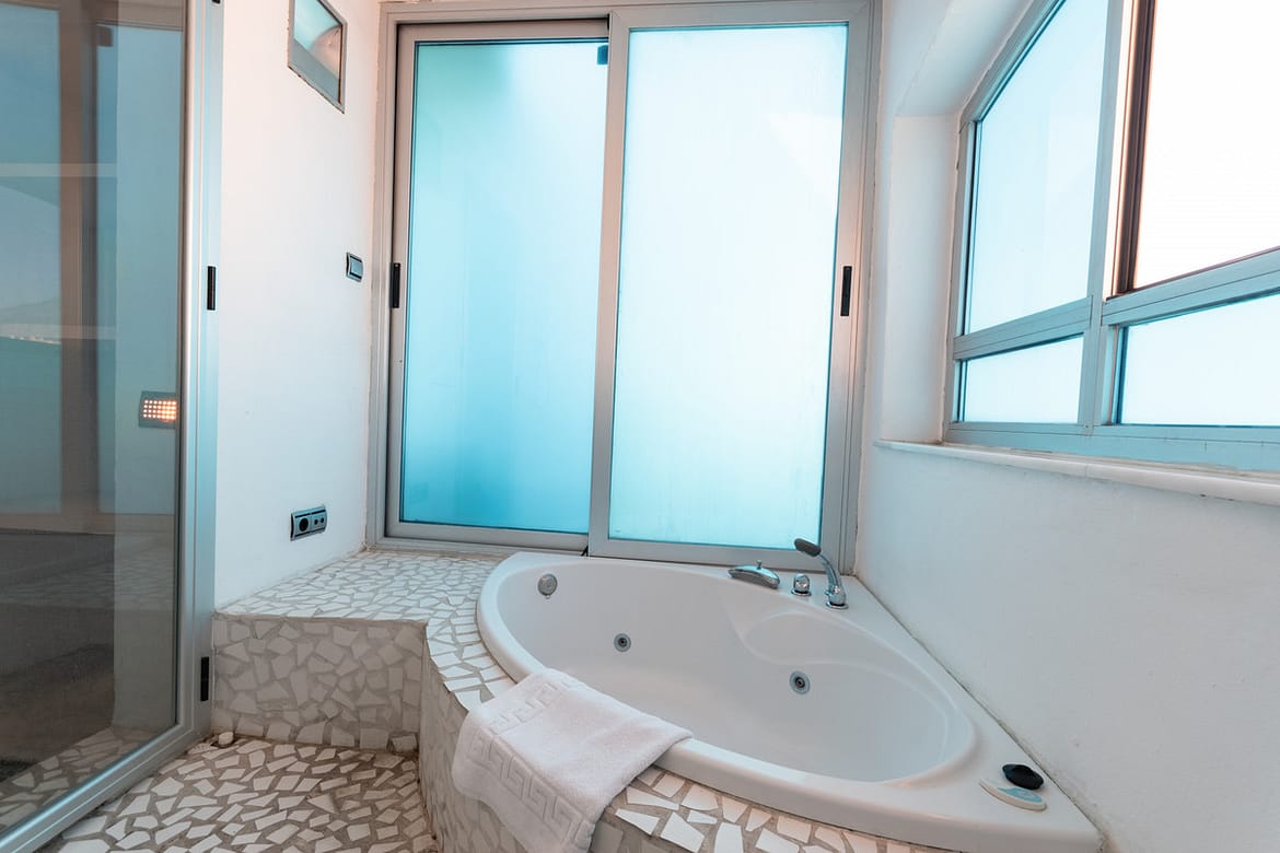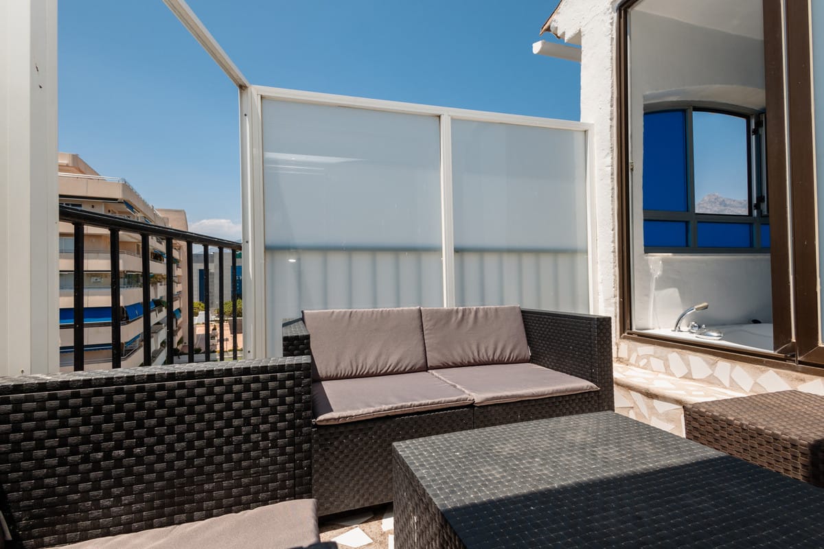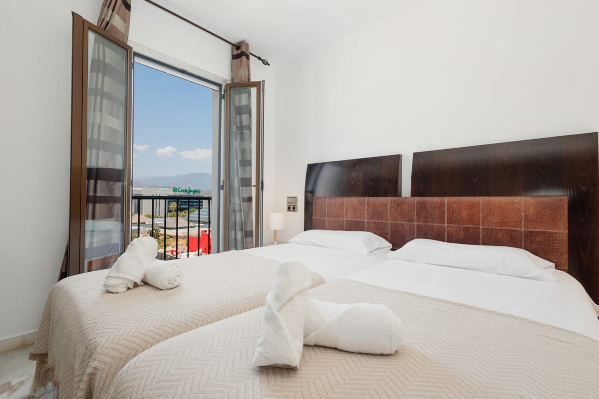 The master bedroom, en-suite, features a comfortable double bed, a large private bathroom with a whirlpool bathtub, separate shower, sink, toilet, and access to a private terrace. The second bedroom, also en-suite, has two single beds, a balcony overlooking Plaza Antonio Banderas, and a full bathroom with a bathtub.