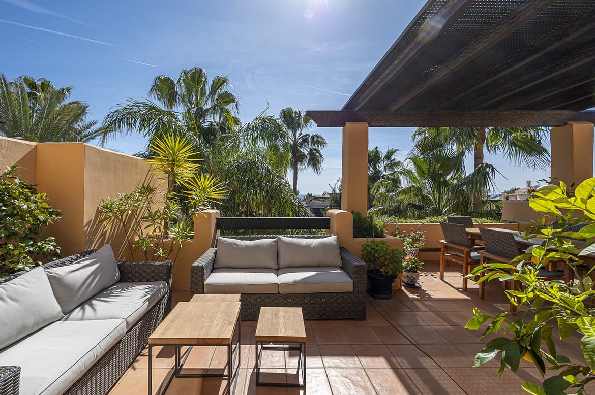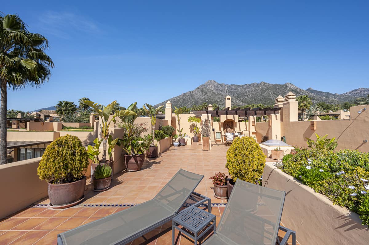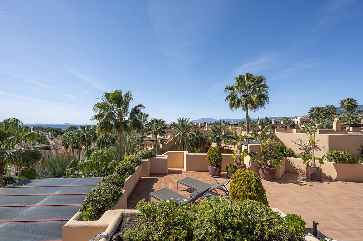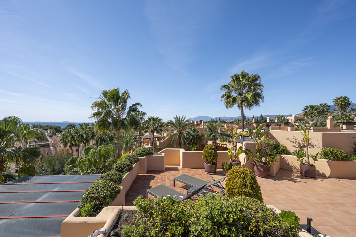 With 163 m² of living space, this luxury penthouse offers breath-taking sea views. The spacious bright living area opens onto a south-facing, 30 m² sun-drenched, partially covered terrace with panoramic views of the Mediterranean. From there, a staircase leads to the 133 m² roof terrace – an idyllic retreat to relax and enjoy the breathtaking panoramic views, including of Marbella's landmark, the shell-shaped mountain "La Concha"