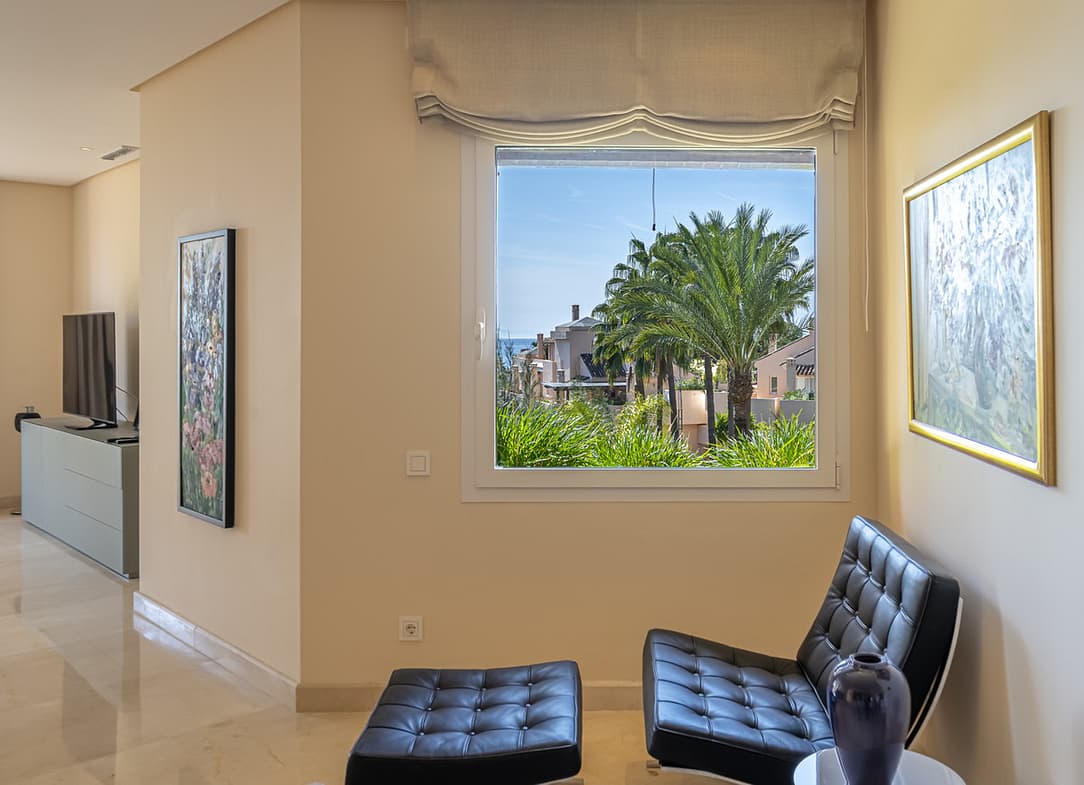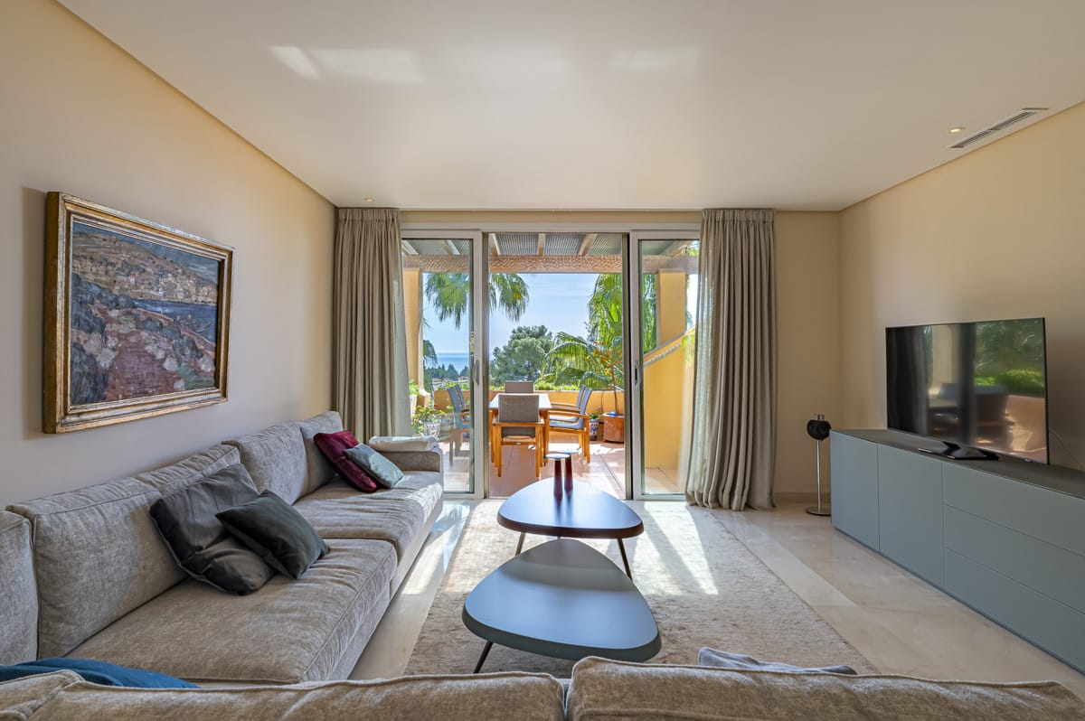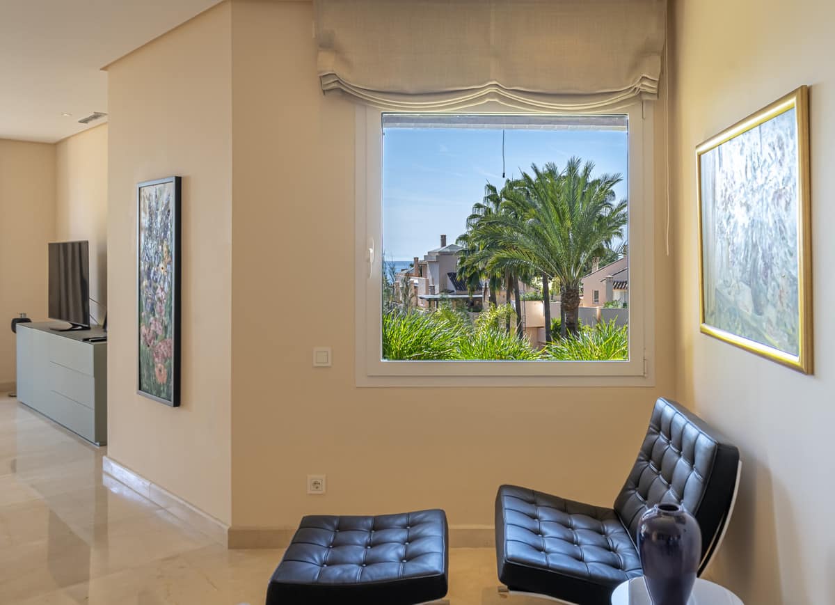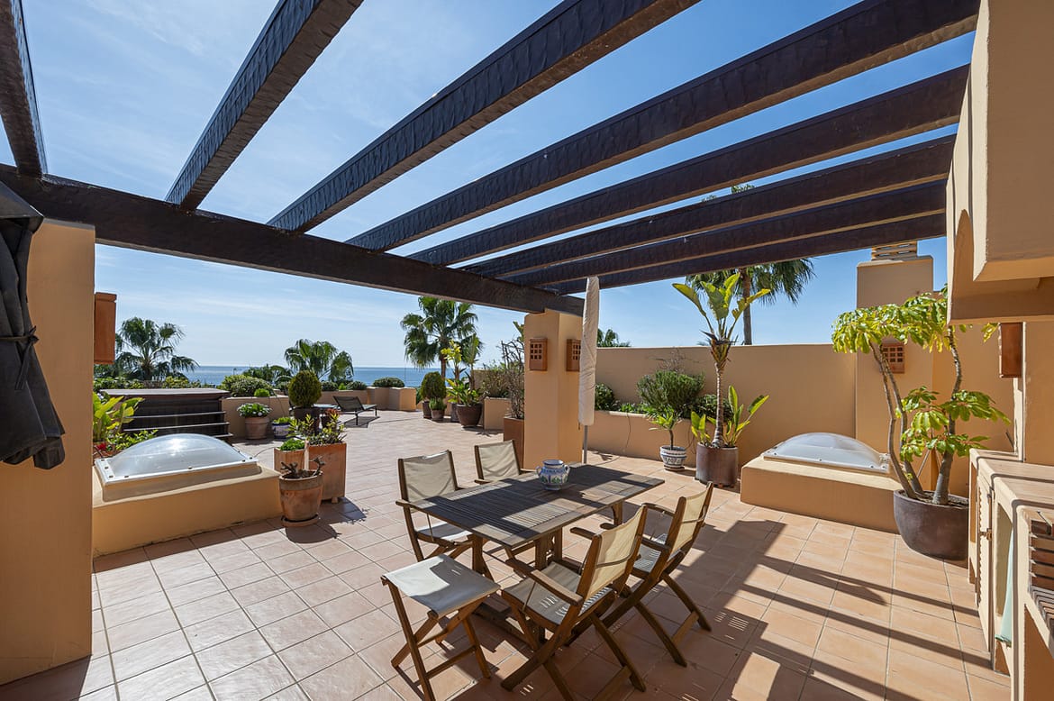 With 163 m² of living space, this luxury penthouse offers breath-taking sea views. The spacious bright living area opens onto a south-facing, 30 m² sun-drenched, partially covered terrace with panoramic views of the Mediterranean. From there, a staircase leads to the 133 m² roof terrace – an idyllic retreat to relax and enjoy the breathtaking panoramic views, including of Marbella's landmark, the shell-shaped mountain "La Concha"