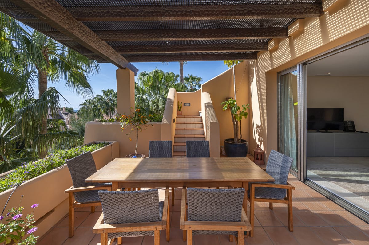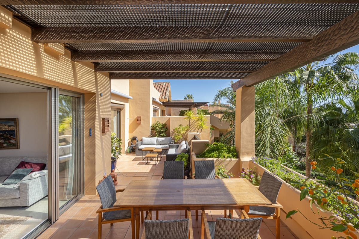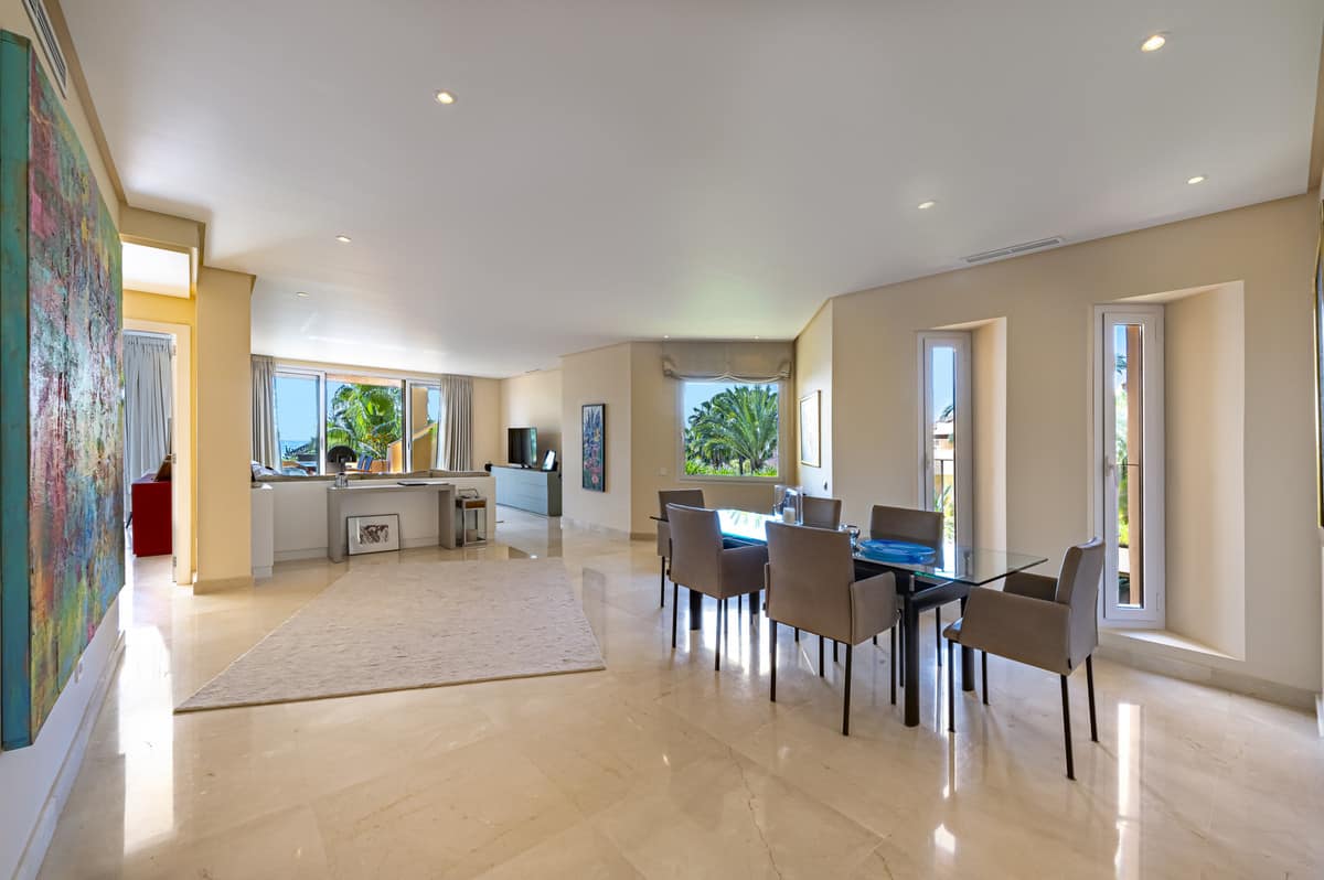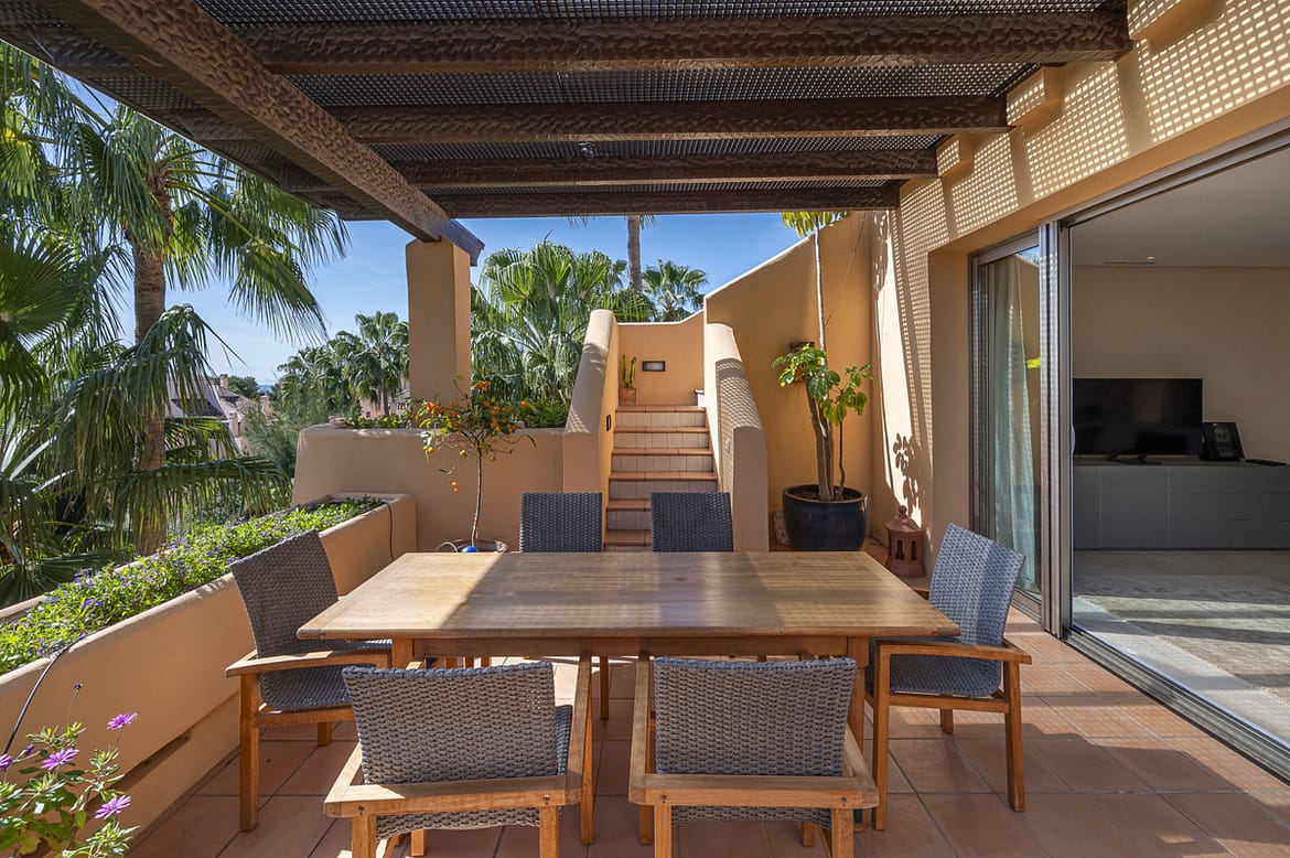 Inside you will find a fully equipped kitchen with utility room, 2 spacious bedrooms and 2 bathrooms. The master suite, equipped with electric blinds, a stylish dressing room, an en-suite bathroom and direct access to the terrace, offers pure luxury.
