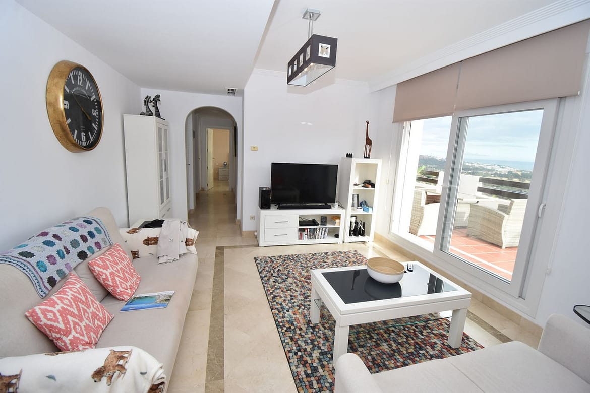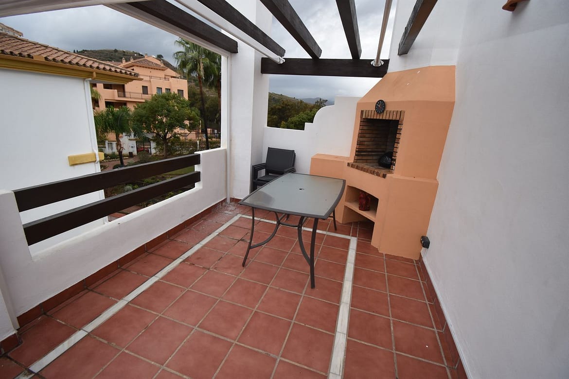 Presented in excellent condition, the penthouse features a fully fitted kitchen, elegant marble flooring and fitted wardrobes. The spacious living area opens seamlessly onto a vast private terrace, ideal for outdoor dining, entertaining, or simply relaxing while enjoying the spectacular views over the golf course, mountains, countryside, and communal gardens. A built-in barbecue makes the terrace perfect for year-round enjoyment.