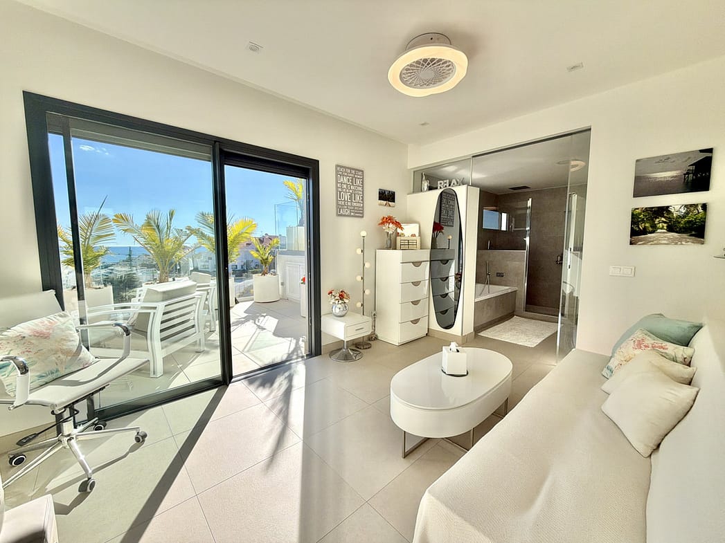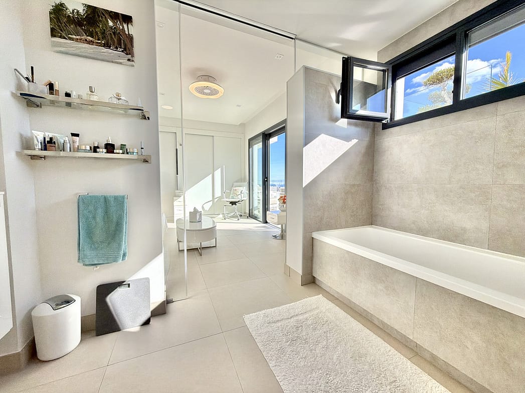 There are two bedrooms, both with ample fitted wardrobes. The master takes advantage of the far reaching Med views and enjoys a large en-suite with both a deep bath, separate walk-in shower and spacious sink unit with deep drawers beneath. The guest bedroom has its own private terrace facing the Mijas mountains.