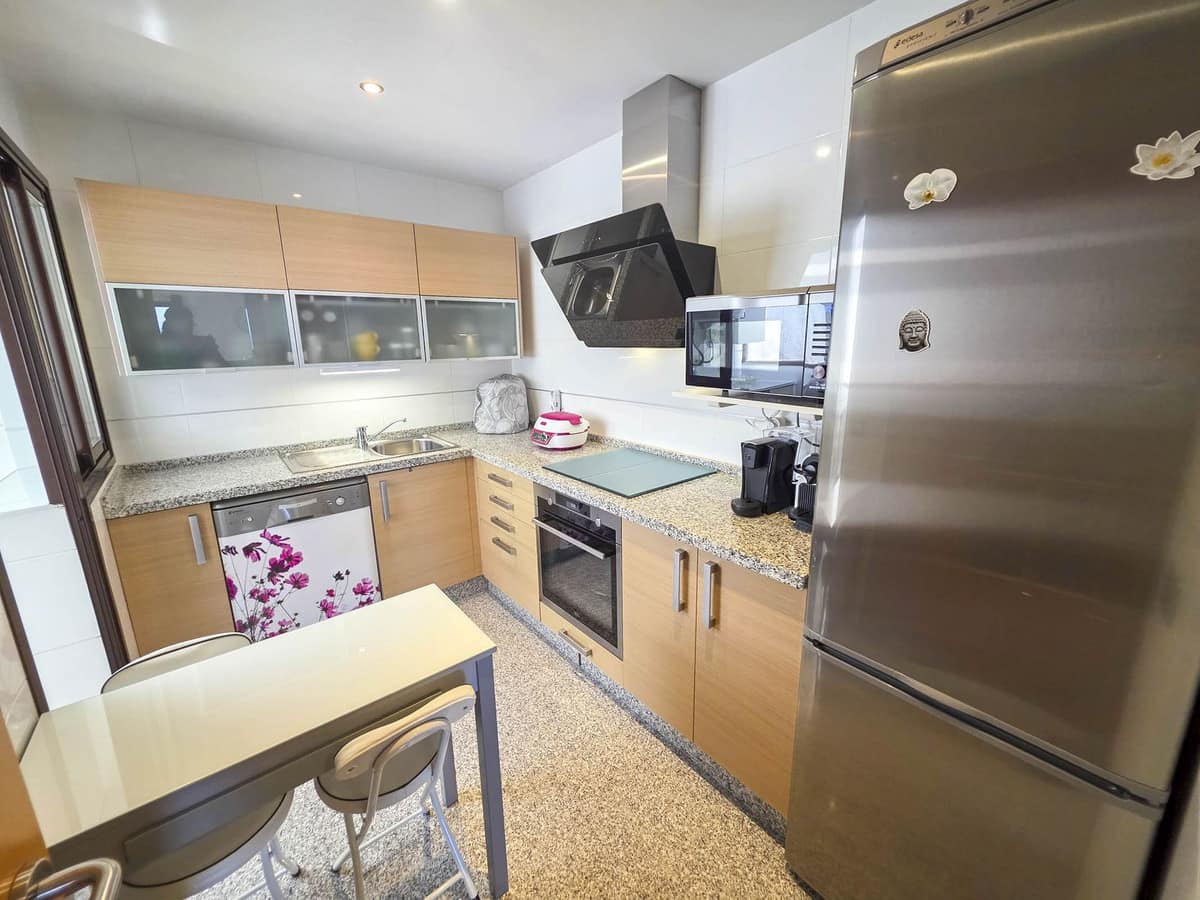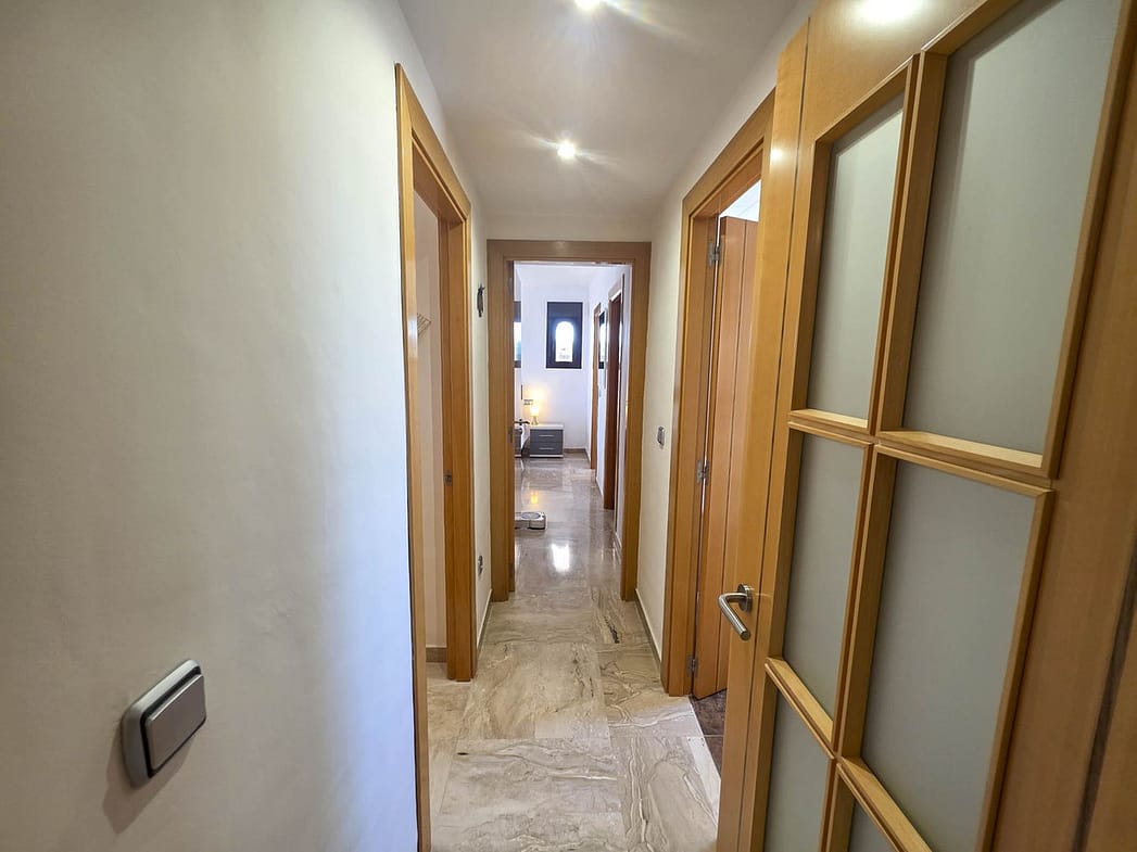 The updated kitchen is independent and well-equipped with modern appliances and granite countertops. Both bedrooms are bright and welcoming, with built-in wardrobes and large windows. The master suite enjoys direct terrace access and a private en-suite bathroom with a hydromassage tub, while the second bathroom has been fully renovated with a walk-in shower and sleek, modern finish.