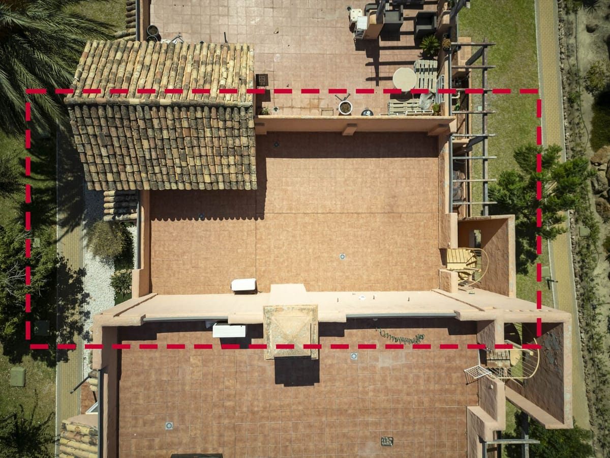 The property features 2 bedrooms and 2 bathrooms, designed for comfort and privacy. The master bedroom has an en-suite bathroom and direct access to the terrace. The bright living-dining room with marble floors connects to a 6 m² terrace, perfect for outdoor breakfasts or relaxing moments. From here, stairs lead up to the spectacular private solarium of approximately 74 m², an outstanding space to sunbathe, host gatherings, or create your own chill-out area with unbeatable views.