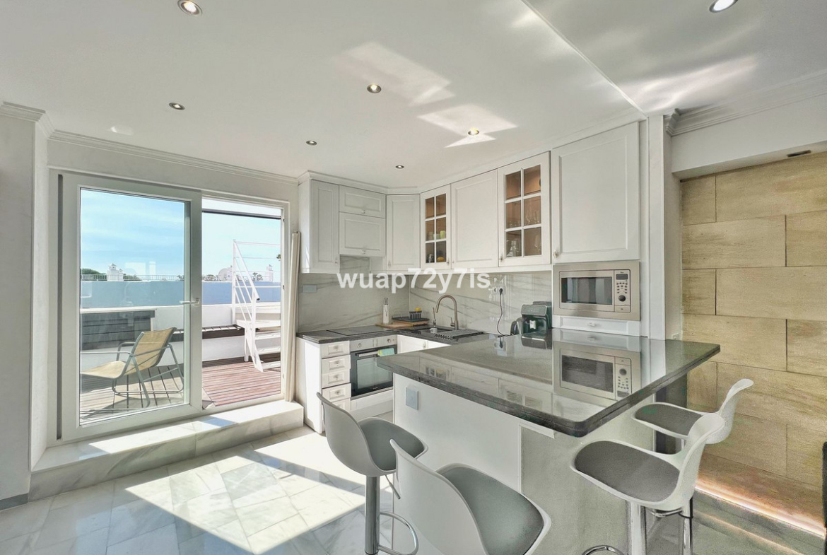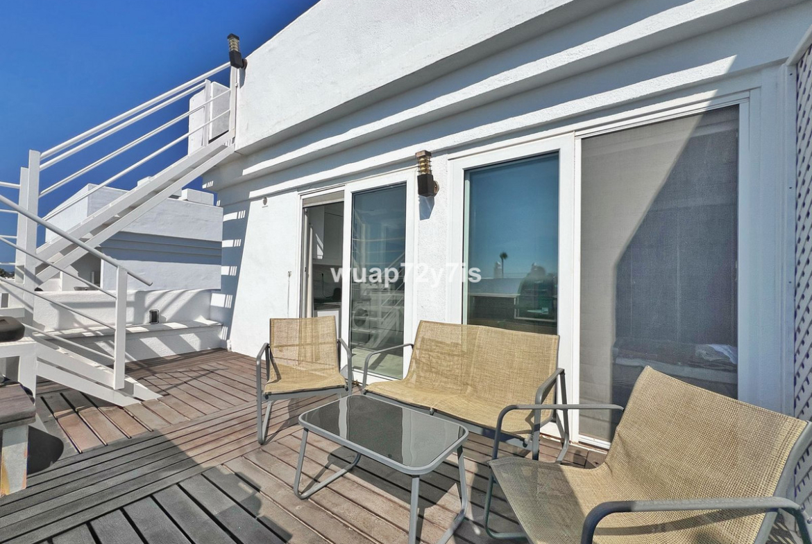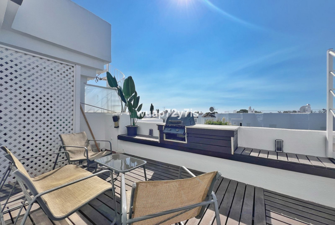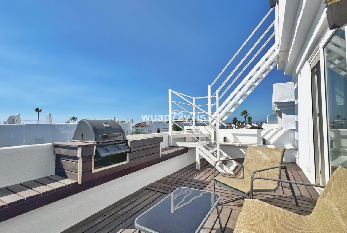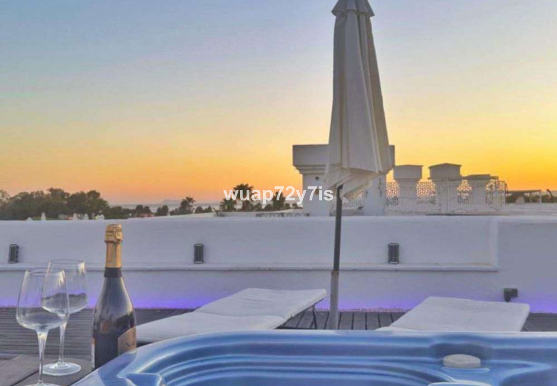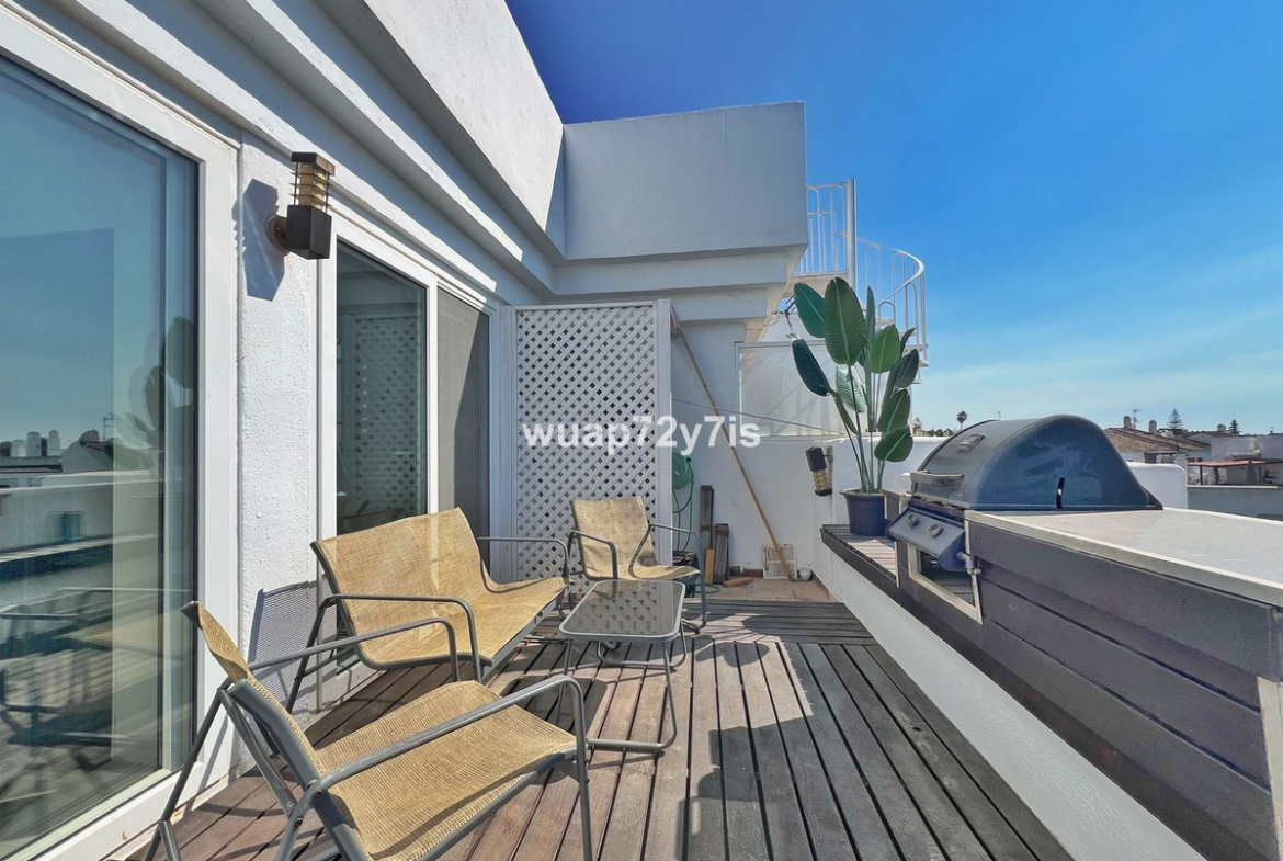This beautifully renovated penthouse is located in the sought-after Sun Gardens urbanization in Estepona East. The community offers a swimming pool and permits short-term rentals, making it an excellent investment as well as a wonderful home. Upon entering, you are welcomed by an entrance hall with access to a guest toilet. To the right, there is a bright open-plan living room with a fully equipped kitchen. From the living area, you step out onto a spacious terrace with a barbecue area — perfect for dining and entertaining. From this terrace, a staircase leads you up to the private rooftop terrace, where you can relax in the jacuzzi, enjoy the additional barbecue space, and take in breathtaking panoramic views of La Concha mountain and the Mediterranean Sea.