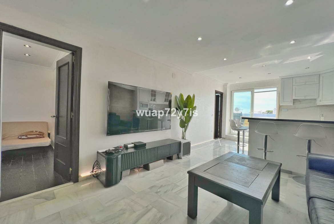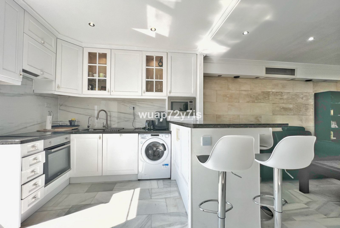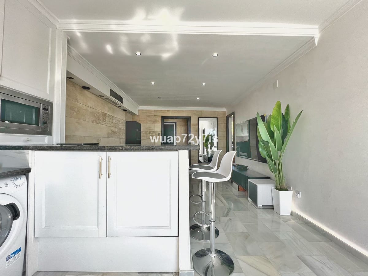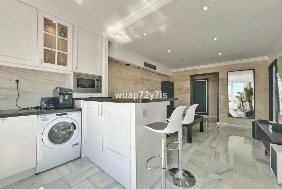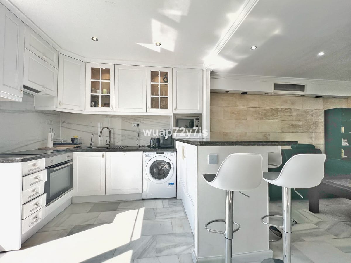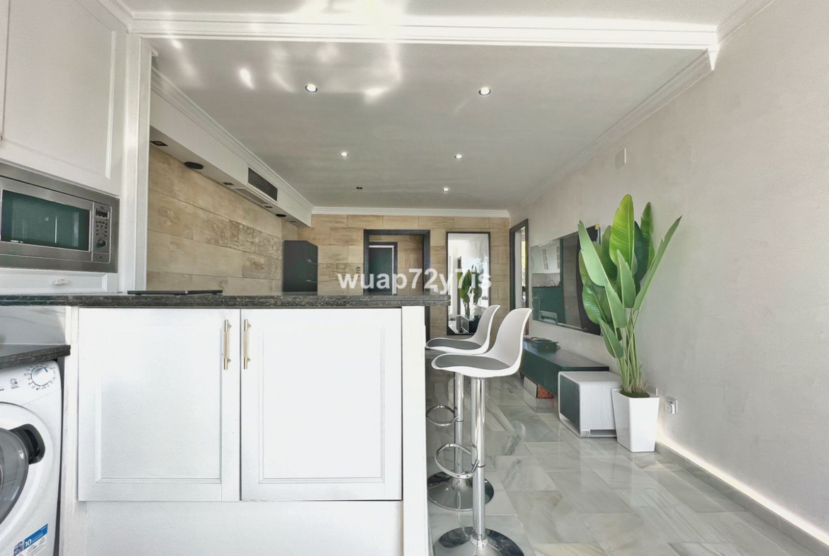 This beautifully renovated penthouse is located in the sought-after Sun Gardens urbanization in Estepona East. The community offers a swimming pool and permits short-term rentals, making it an excellent investment as well as a wonderful home. Upon entering, you are welcomed by an entrance hall with access to a guest toilet. To the right, there is a bright open-plan living room with a fully equipped kitchen. From the living area, you step out onto a spacious terrace with a barbecue area — perfect for dining and entertaining. From this terrace, a staircase leads you up to the private rooftop terrace, where you can relax in the jacuzzi, enjoy the additional barbecue space, and take in breathtaking panoramic views of La Concha mountain and the Mediterranean Sea.