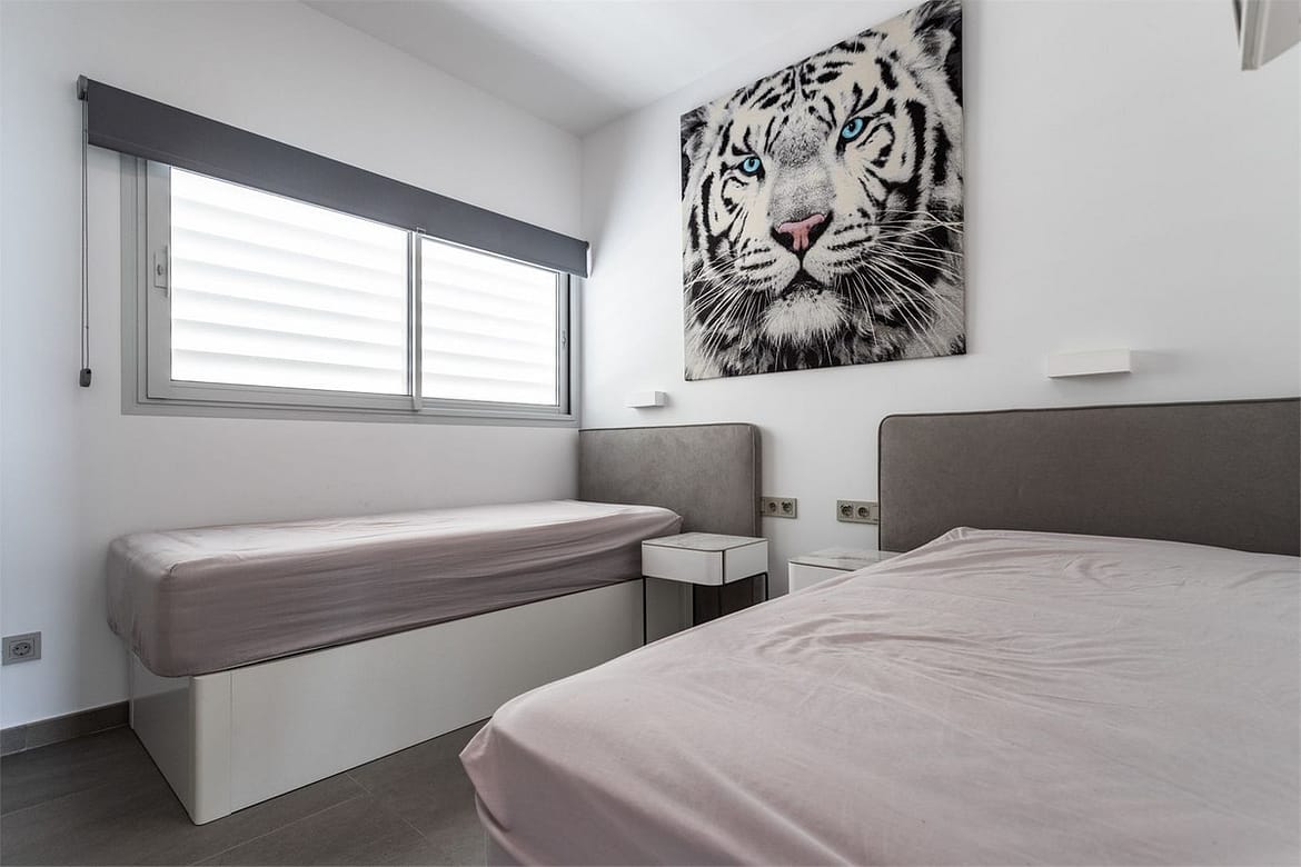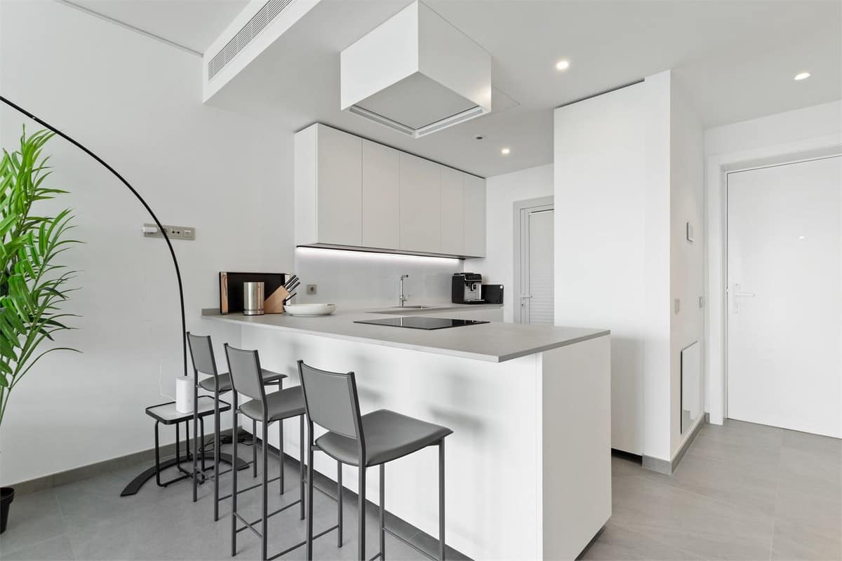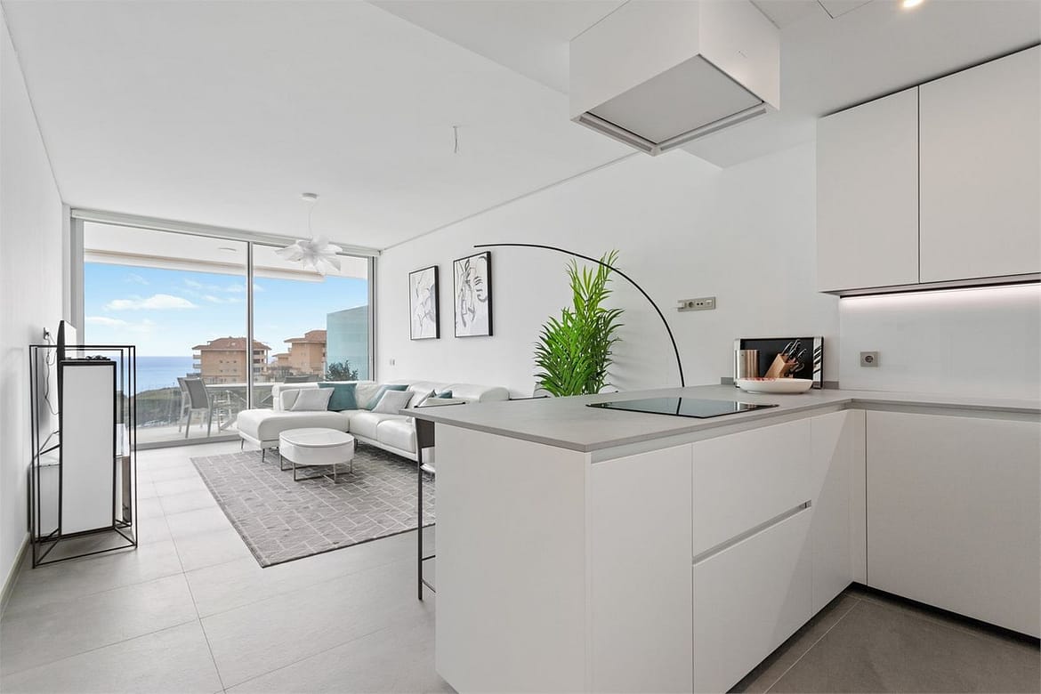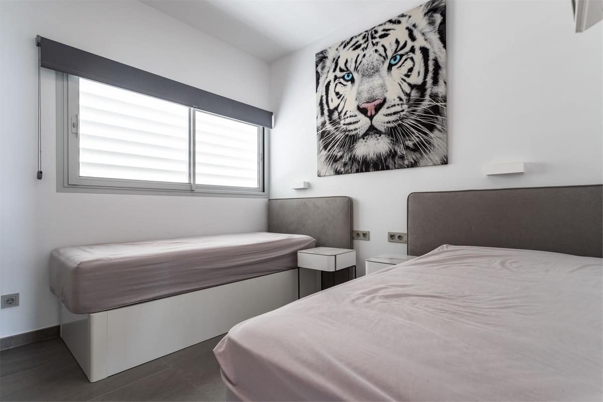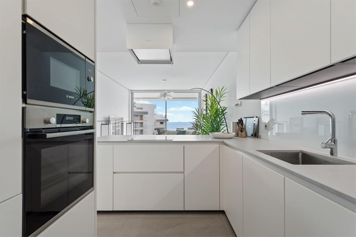 The property has a modern style and offers two bedrooms and two bathrooms, one of which is en-suite. The open kitchen and living room create a spacious and inviting atmosphere. Through the sliding doors, we access a southwest-facing terrace of 22 sqm with an impressive view of the Mediterranean Sea. Additionally, there is a rooftop terrace of 107 sqm with an installed jacuzzi, perfect for relaxation.