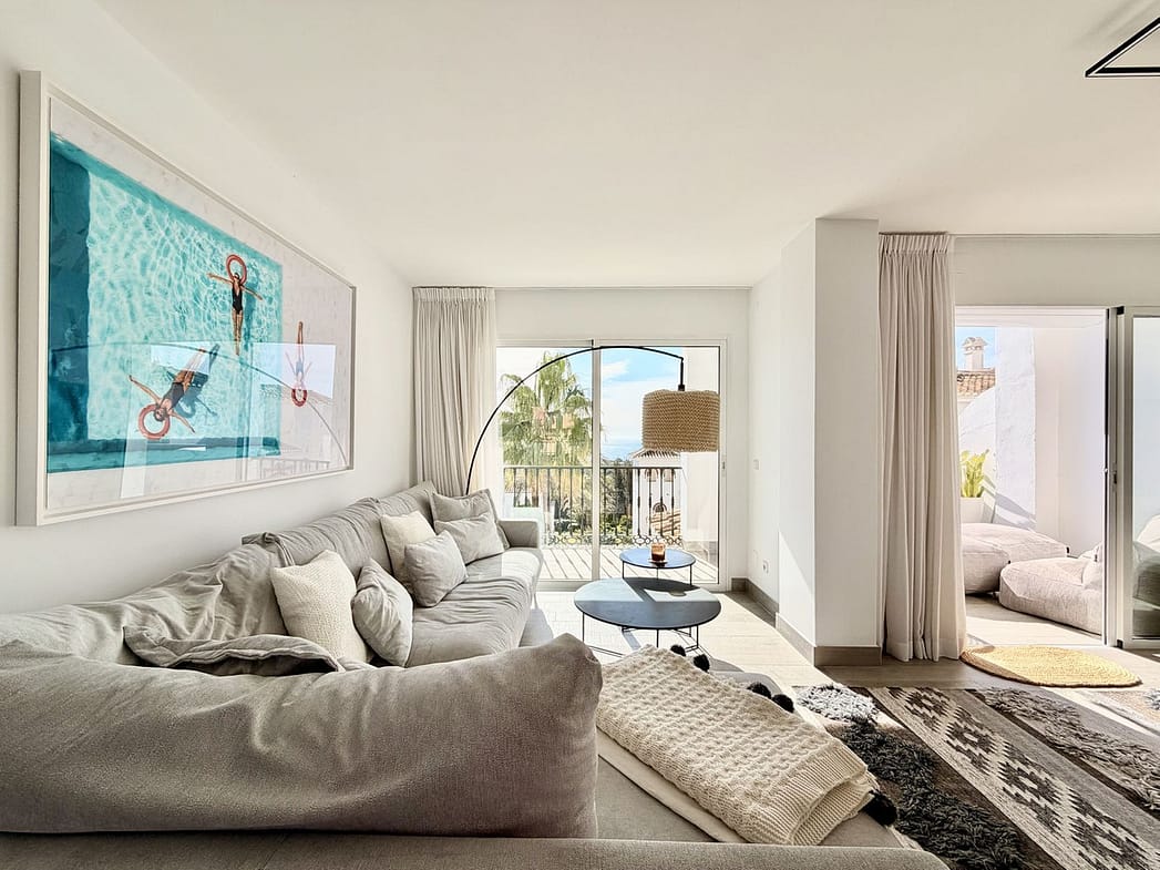 Indulge in refined coastal living in this elegant, newly renovated penthouse, set within a peaceful Andalusian community in the prestigious Marbella East, Las Chapas. Designed for comfort and sophistication, this residence offers breathtaking sea and mountain views, generous outdoor spaces, and a serene atmosphere just minutes from Marbella’s finest beaches.