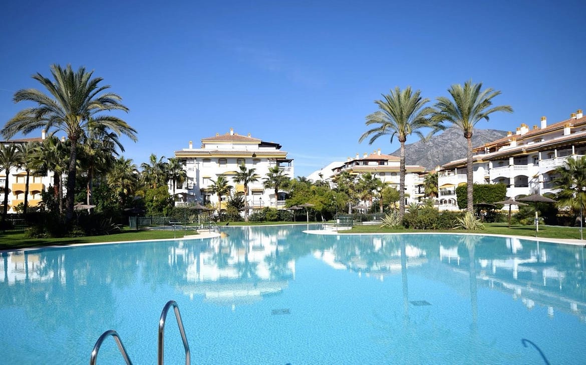 Within the gated community, residents benefit from extensive facilities. Tropical gardens surround multiple swimming pools, including children’s areas open during the summer months. Six paddle tennis courts, a secure children’s play zone with swings and climbing frames, and an on-site bistro create a complete residential setting.