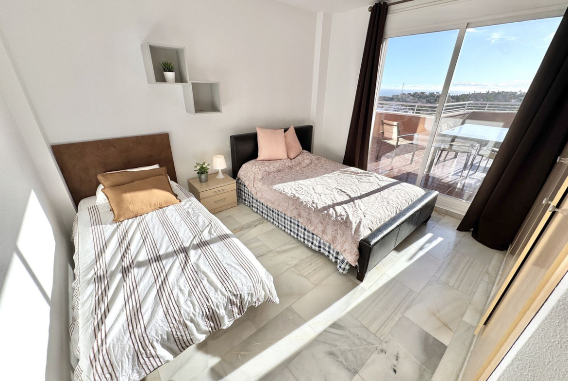 New to market – 2 bed, 2 bath penthouse in Mijas Costa with enormous 150m2 wrap around terrace / solarium, all with beautiful panoramic sea views.