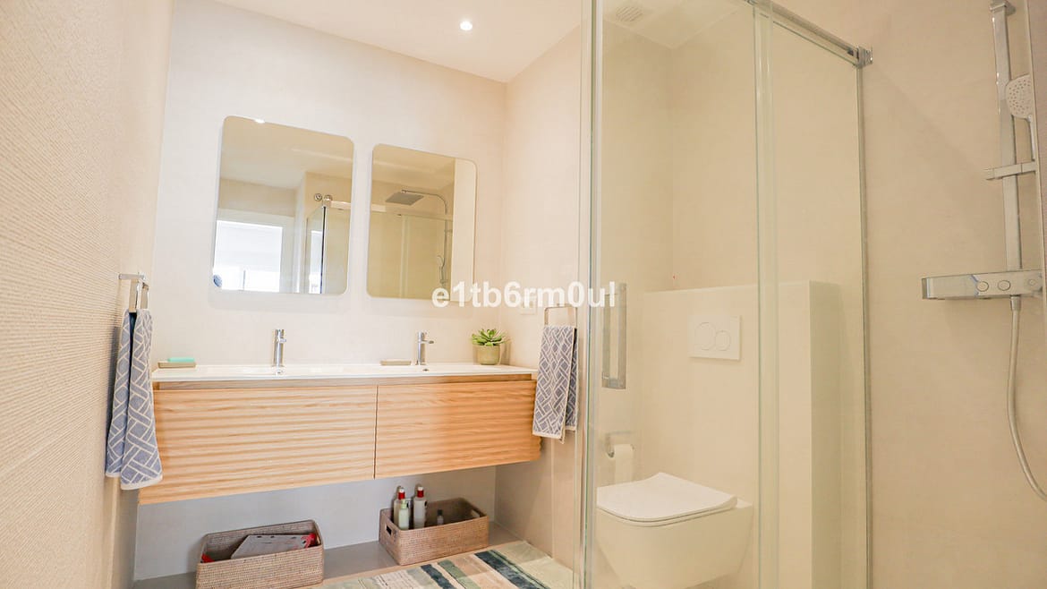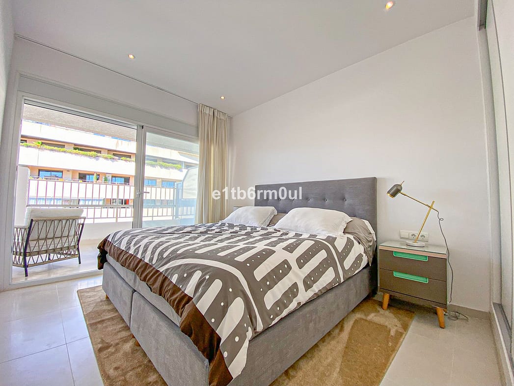 Beachside recently reformed, to a very high standard, apartment that is ready to move into. This fabulous bright, spacious, airy apartment is a perfect home or investment property. The location is ideal, only a three-minute walk to the beach and Marbella’s Paseo Maritimo. A short walk into the centre Marbella and 5 minutes from Puerto Banus. With an open-plan layout, the fully fitted kitchen flows effortlessly to the dining area and living room. The two double ensuite bedrooms are distributed on either side of the living room area ensuring privacy and giving both bedrooms access to the spacious terrace. The terrace has a seating area and an outdoor dining area that comfortably seats six people and enjoys panoramic views over the Golden Mile and towards the mountains. The community has beautiful quiet gardens and two swimming pools. There is communal car parking for residents.