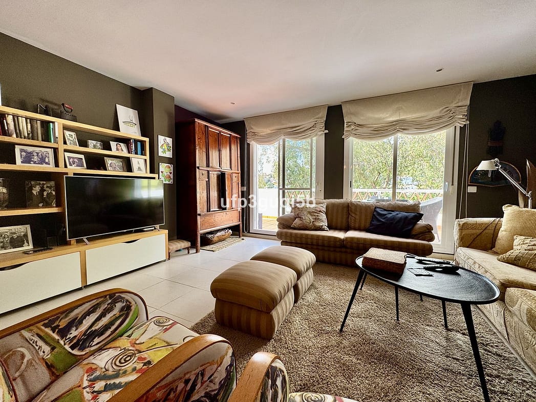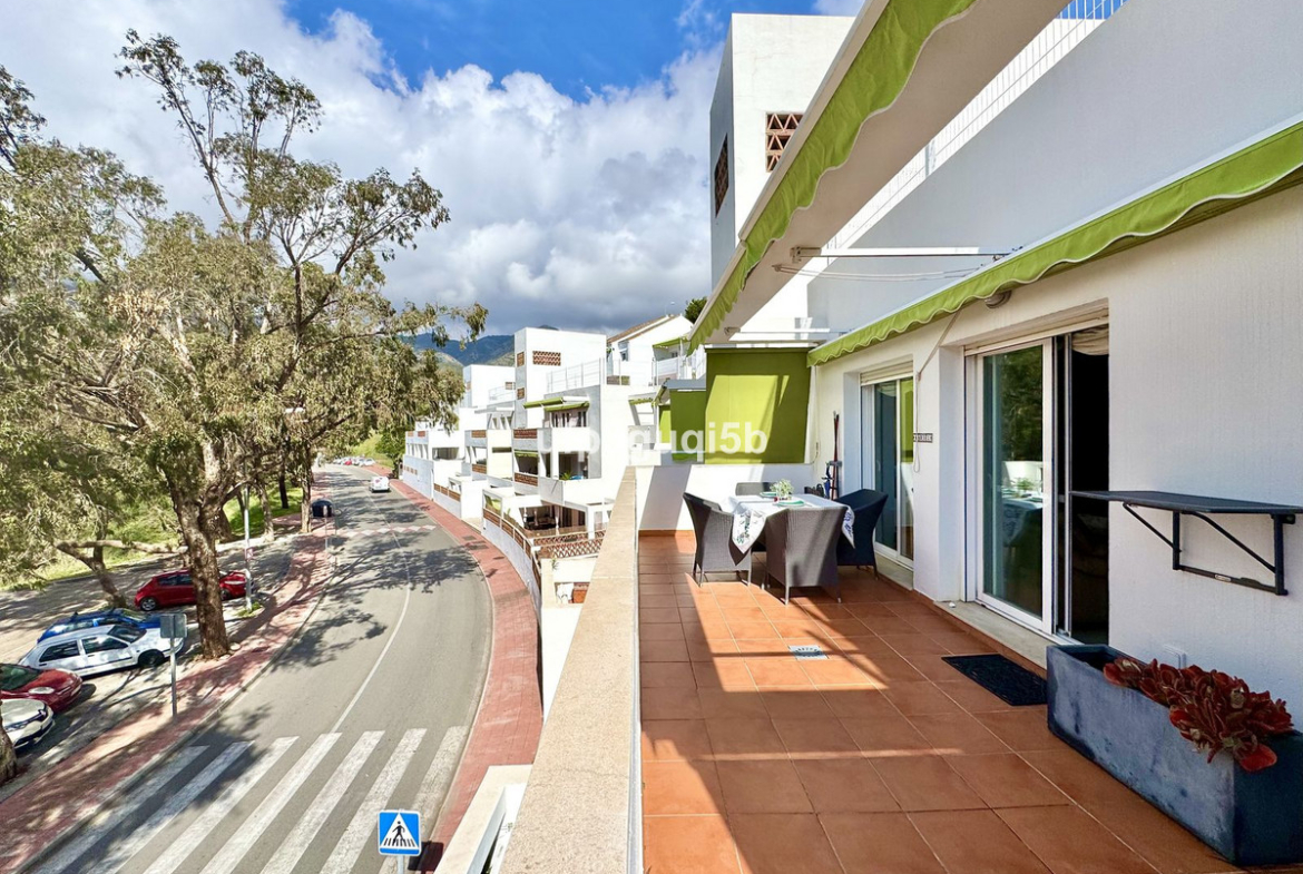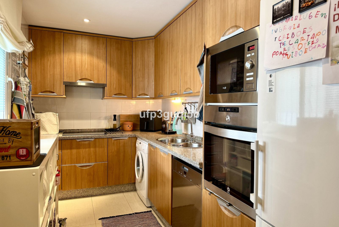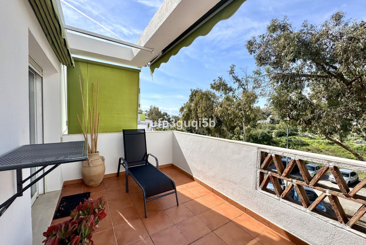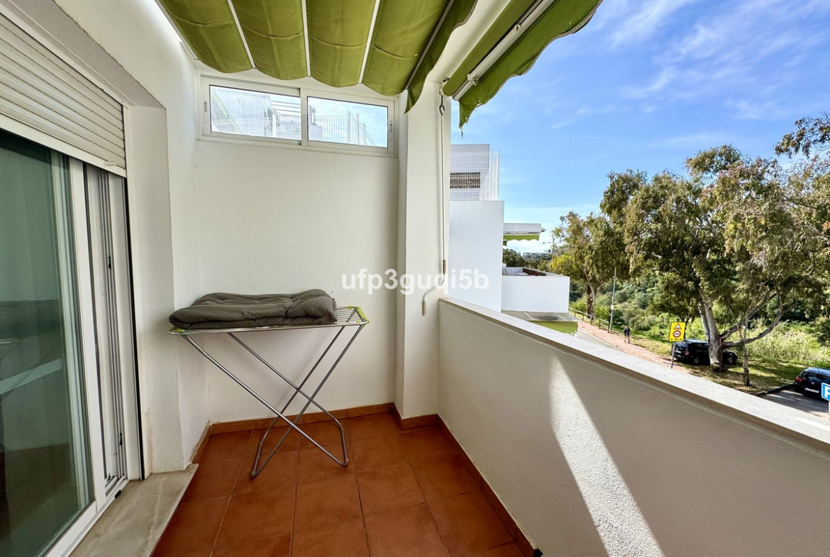 The home that is located on the second floor in a gated community, consists of an entrance hall with wardrobes leading in to a spacious dining and living room. The kitchen is separate and fully fitted with all appliances. From the lounge you can access a lovely terrace with sun most of the day but with awnings so you can get a nice shade in the warmer seasons. The terraces overlook the green area in front of the urbanization and that cannot be built.