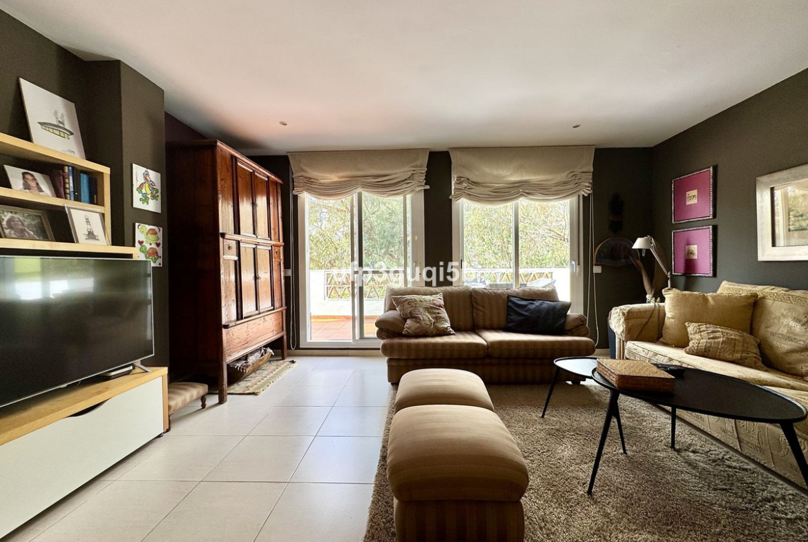 There are 2 double bedrooms with fitted wardrobes and 2 bathrooms with marble tiles on the walls. The ensuites bathroom has a bathtub with hydromassage. The guest bedrooms has access to the main terrace and the master bedrooms has a smaller private terrace. There is centralized aircondition throughout the house with hot and cold air. The double glazed windows have blinds and mosquito nets.