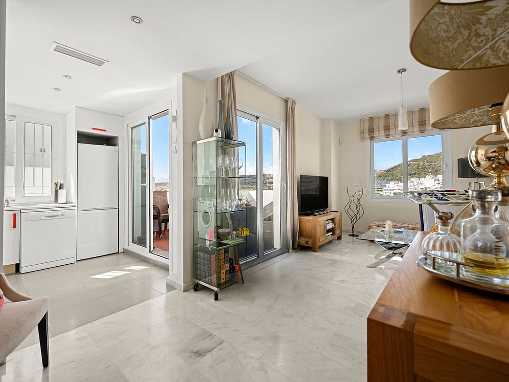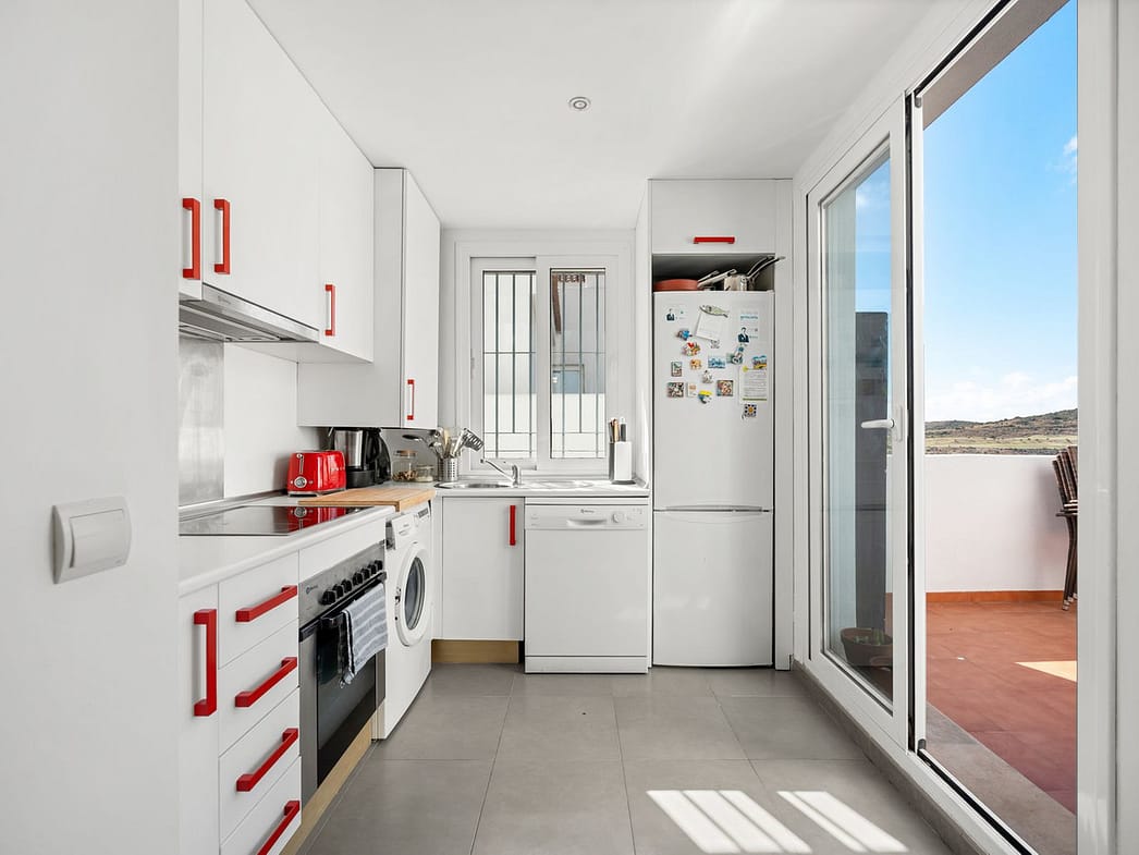 The living-dining room stands out for its spaciousness and luminosity, with direct access to a pleasant private terrace from where you can enjoy impressive panoramic views of the golf course and the sea. The kitchen is fully equipped with quality appliances, ideal for those who value both design and functionality.