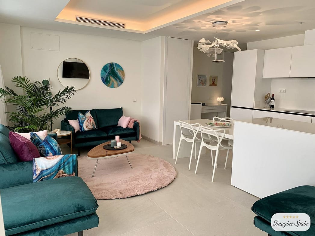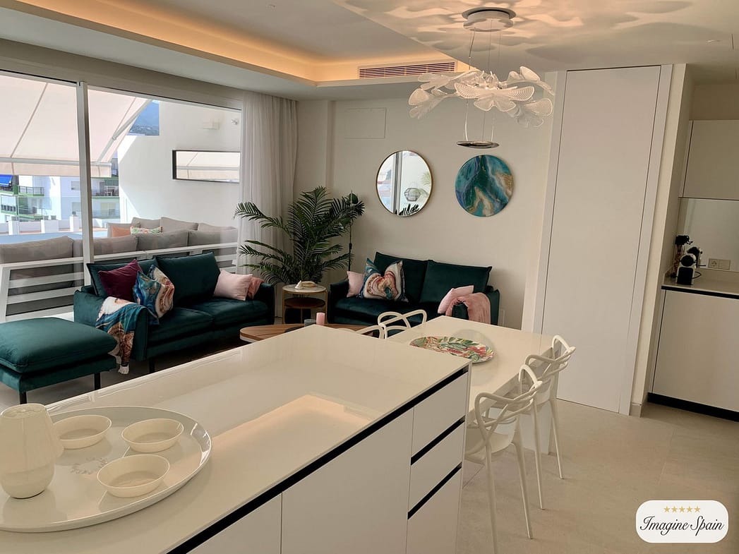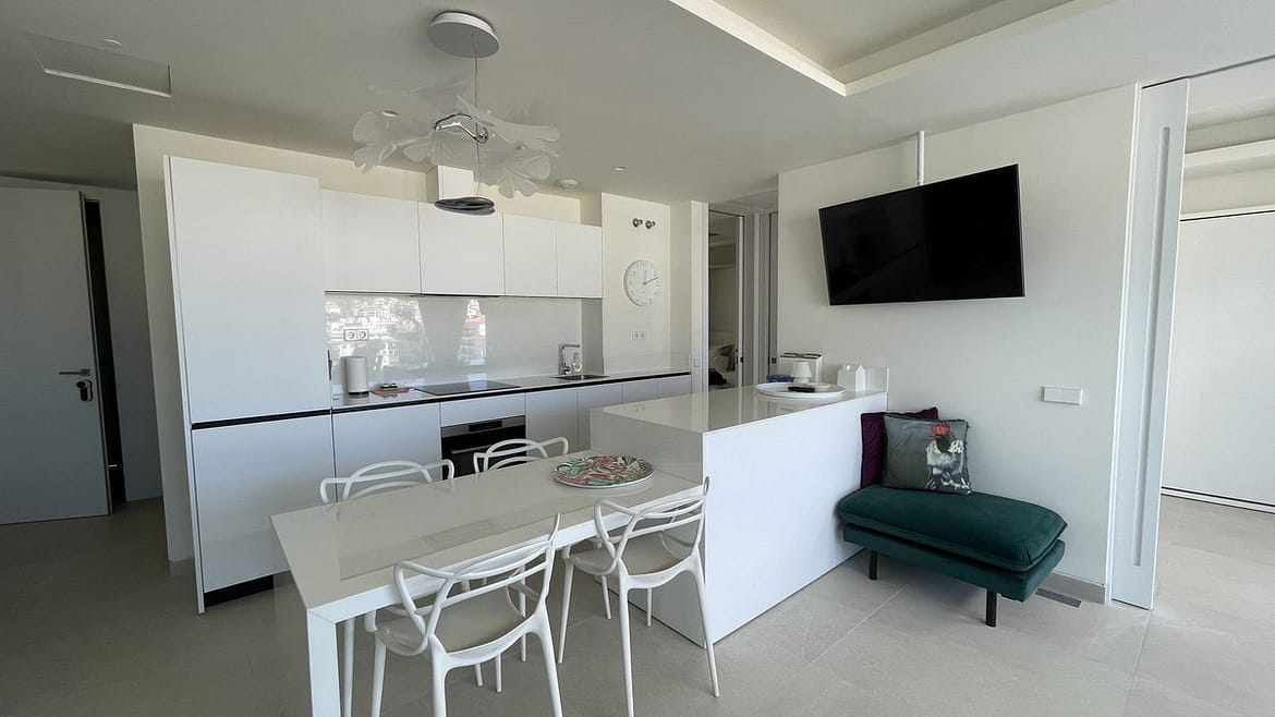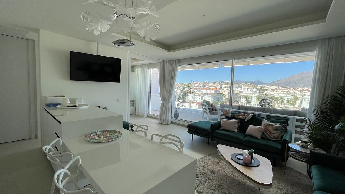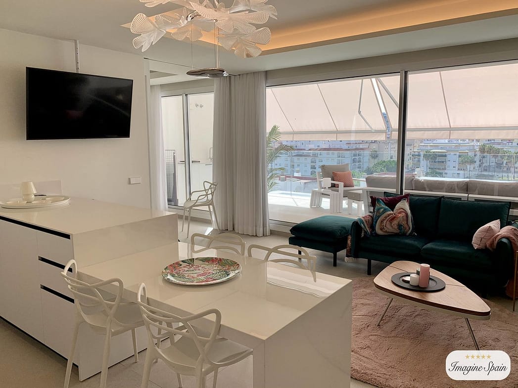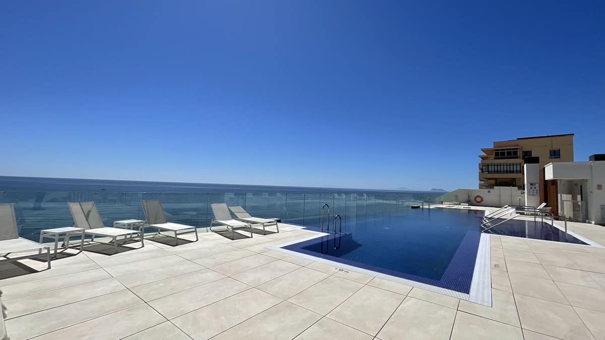 Beautiful top floor apartment on the beachfront, entrance from the new Estepona promenade. Very central, next to all kinds of services and amenities. Panoramic views to the town of Estepona and Sierra Bermeja. It is located in a luxury, inteligent and efficient building, recently build. The apartment has been modified to have two bedrooms instead of one. The modern kitchen is equipped with AEG appliances and includes a hob, oven, microwave, refrigerator, washingmachine and dryer. Large terrace with grill and dishwasher. Aerothermal air conditioning and underfloor heating. The apartment includes a garage space and storage room. The building has a pool on the roof, toilets, Jacuzzi, gym and BBQ