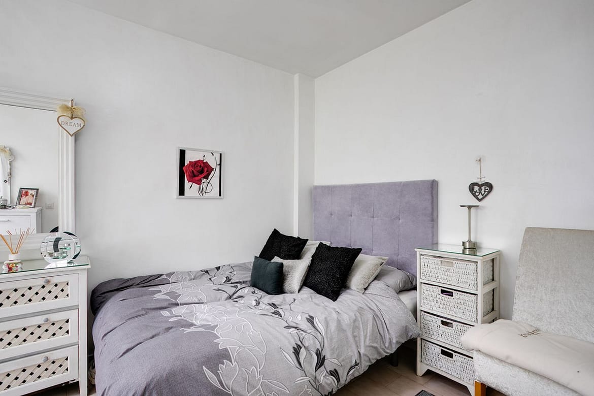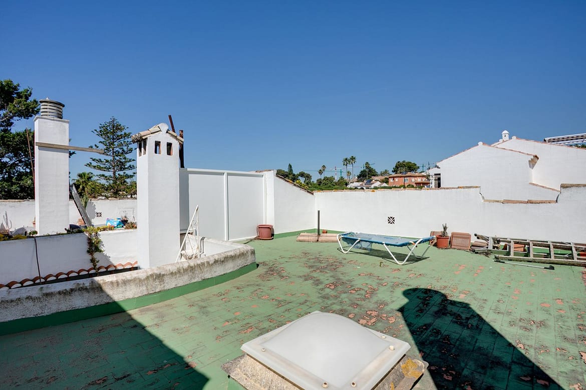 This property is located to the west of Estepona port and conveniently located close to shops and just a stones throw from the beach. The property has 2 double bedrooms which share the family bathroom, semi open kitchen and living room which open onto the balcony, from which you have great sea views. Off the kitchen is a small courtyard style terrace with stairs up to the roof terrace which is very large and here also is another room currently used as a storage room but can be converted into another room with access made from in the living room.