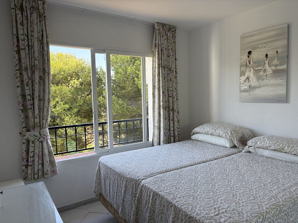 The property features two bedrooms and a bathroom, plus a large, sunny living room with a fully equipped kitchen.