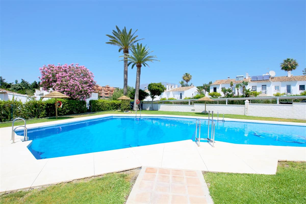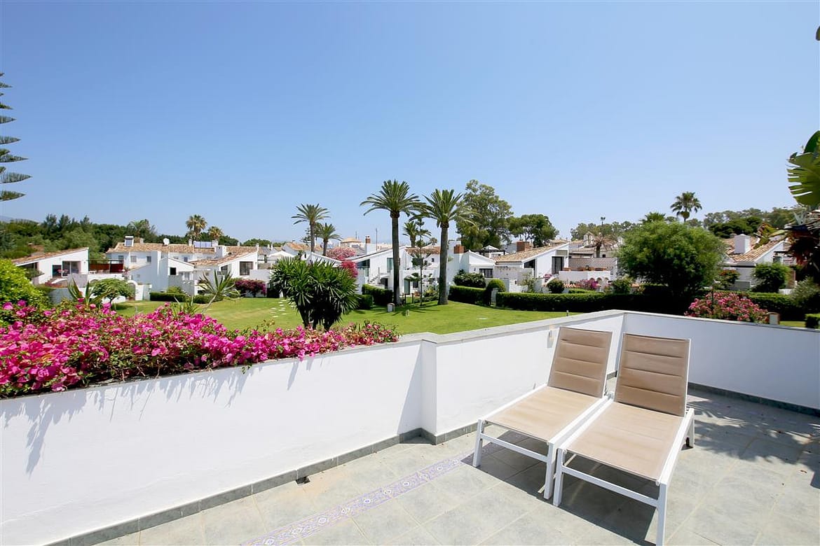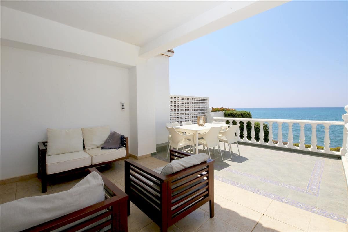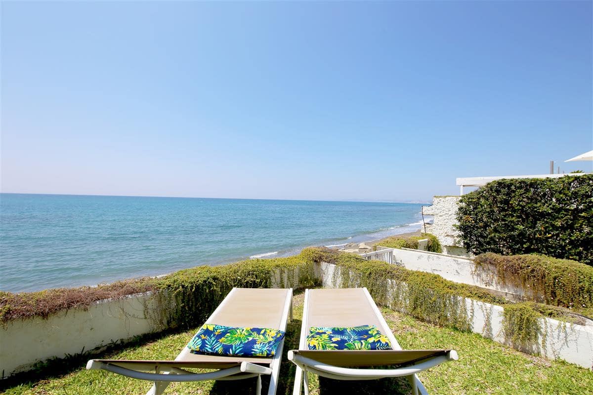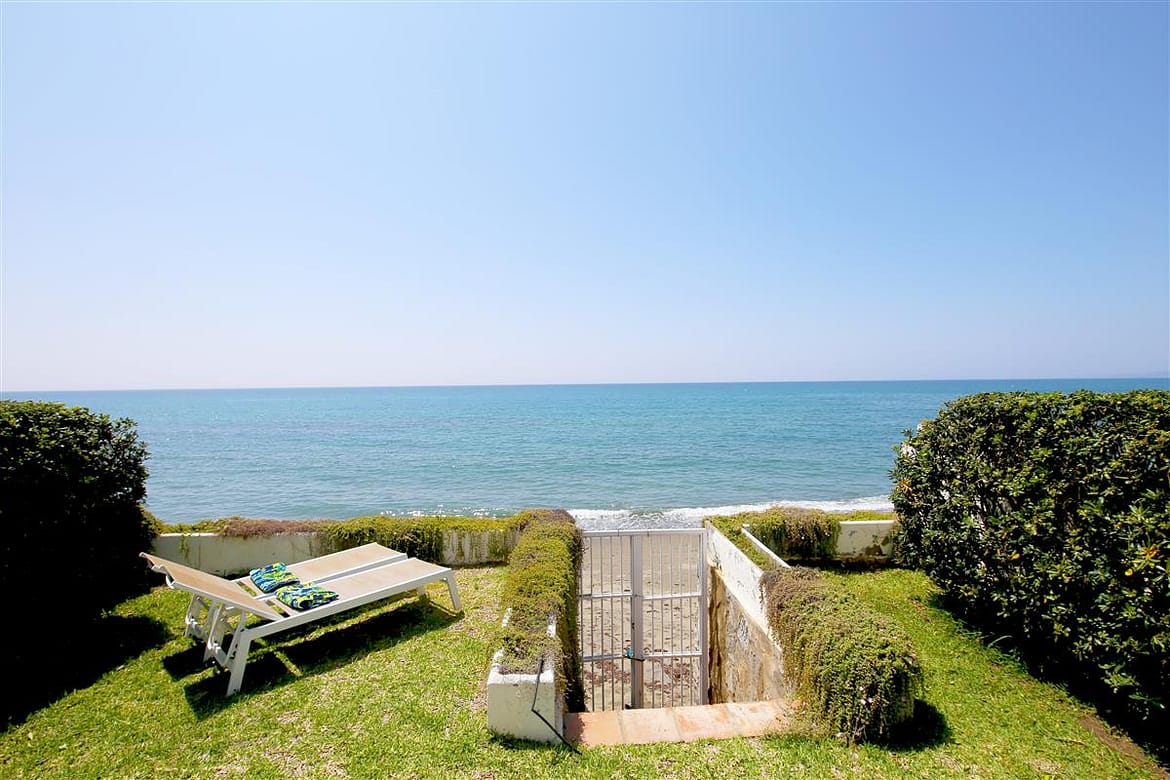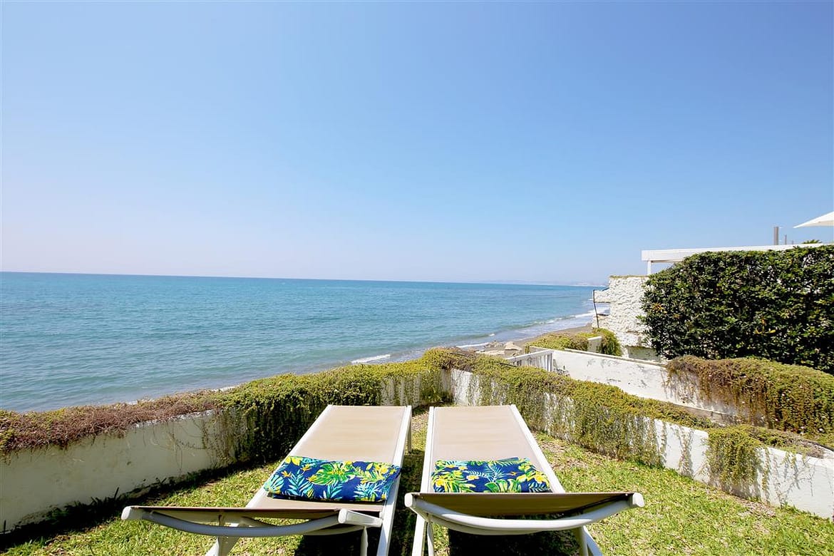 Beautiful sea front terraced townhouse located in the popular Villas Andaluzas complex, on the eastern edge of Estepona, with access directly to the beach from the private garden and community pool. This charming property has two bedrooms and two bathrooms, providing comfortable accommodation for four people. The master bedroom is equipped with a king size bed (160x200cm), an en-suite bathroom with a shower, toilet, hand basin and bidet; plus plenty of storage space in its built-in wardrobes. The bedroom has direct access to a private terrace overlooking the garden and offering direct sea views. The second bedroom is equipped with two single beds (90x200cm), another en-suite bathroom with a shower, toilet, hand basin and spacious built-in wardrobes. The modern living room offers stunning sea views and has direct access to a second large terrace with an outdoor dining area for six people and a comfortable seating area with magnificent views. The living-dining room has a comfortable sofa and a flat-screen TV offering a wide selection of national and international channels including Sky. There is a dining area next to the open-plan kitchen with seating for four. The open-plan kitchen is very well-equipped with everything you could need for your holiday. A private sunny terrace is also available with sun loungers for sunbathers. The property also features a private garden with additional sun loungers and direct views of the sea and beach plus a gas barbecue for alfresco dining. The property is air-conditioned throughout and high-speed Wifi is also available for guests. Overall, this is a fantastic opportunity for your vacation on the Costa del Sol.