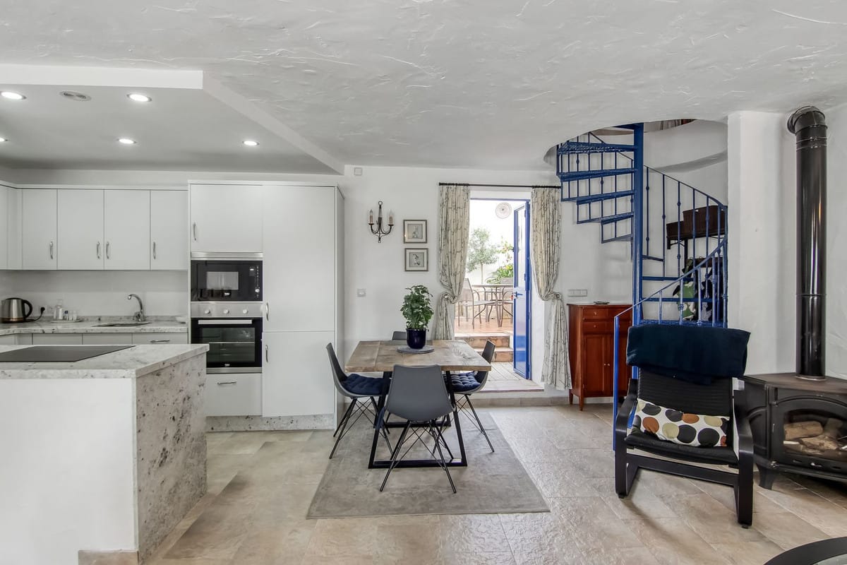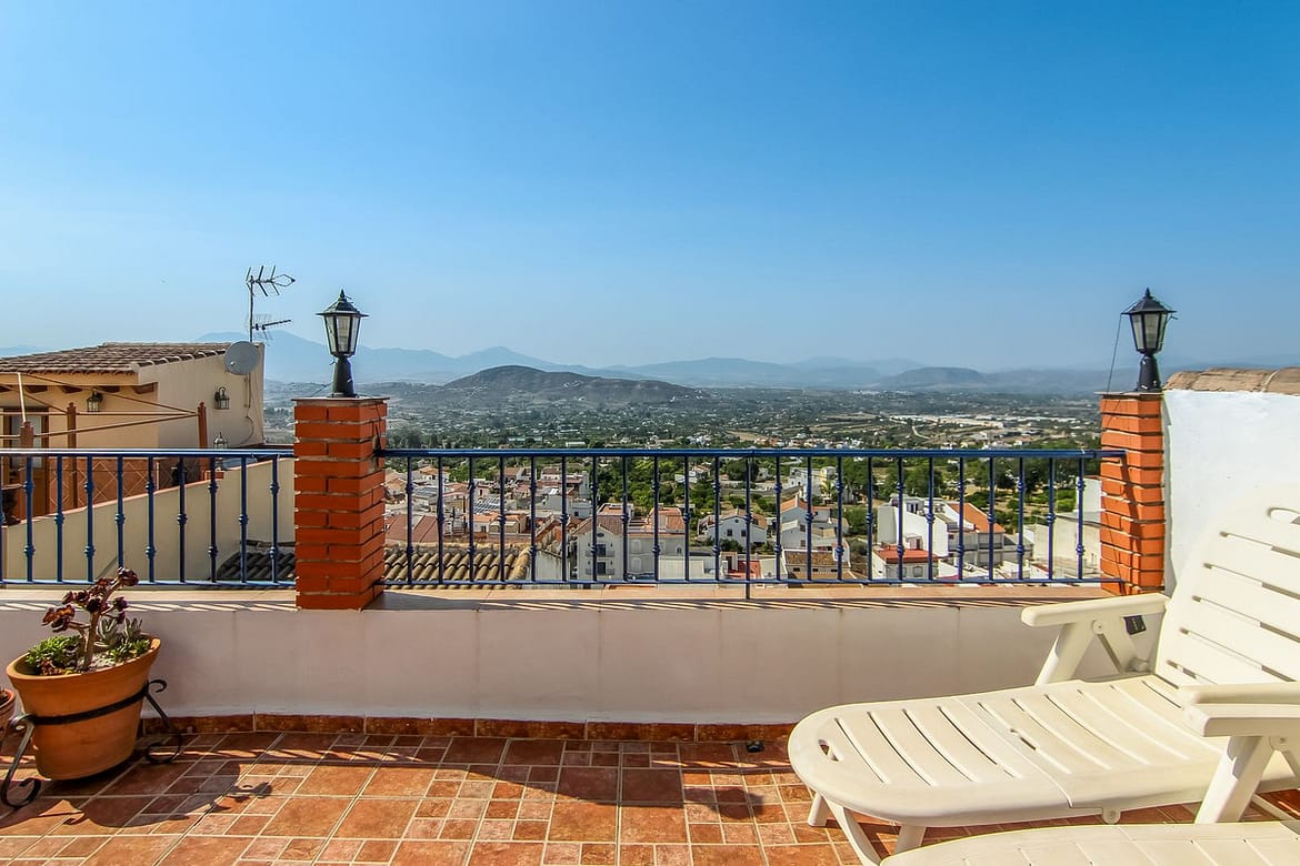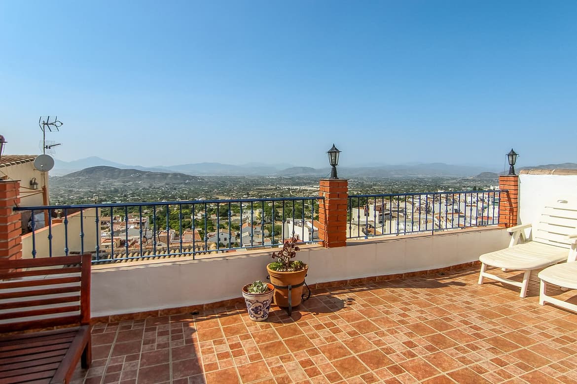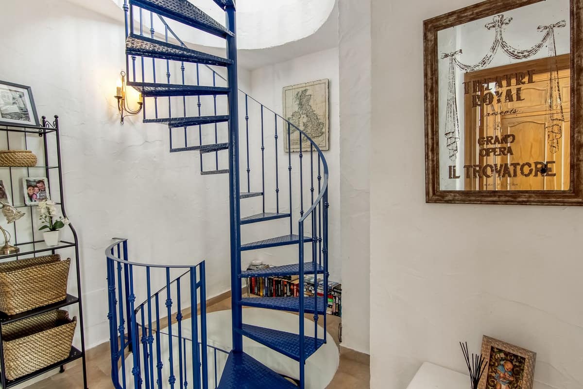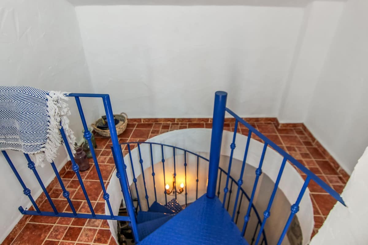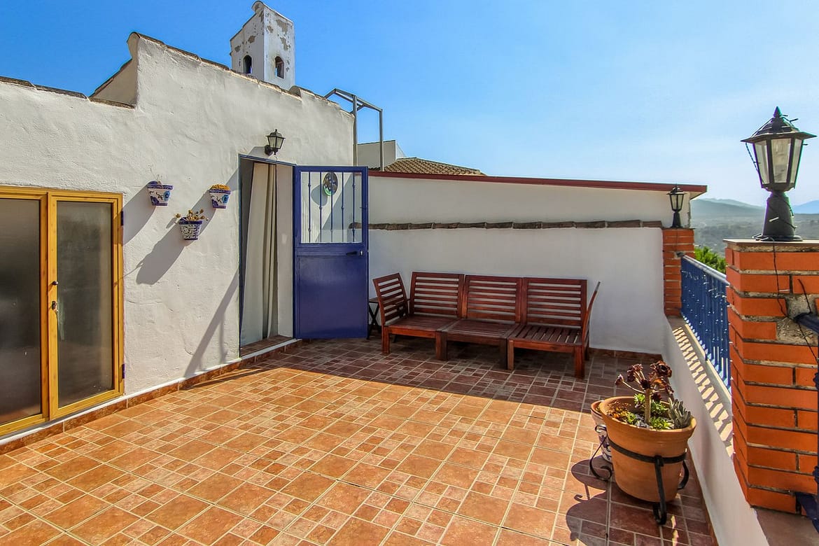 Spiral staircase takes you upstairs to the bedrooms and bathrooms. One floor more, and you enjoy your private roof terrace with amazing Guadalhorce Valley and pueblo views. Very practical utility/storage room on the roof terrace with washing machine.