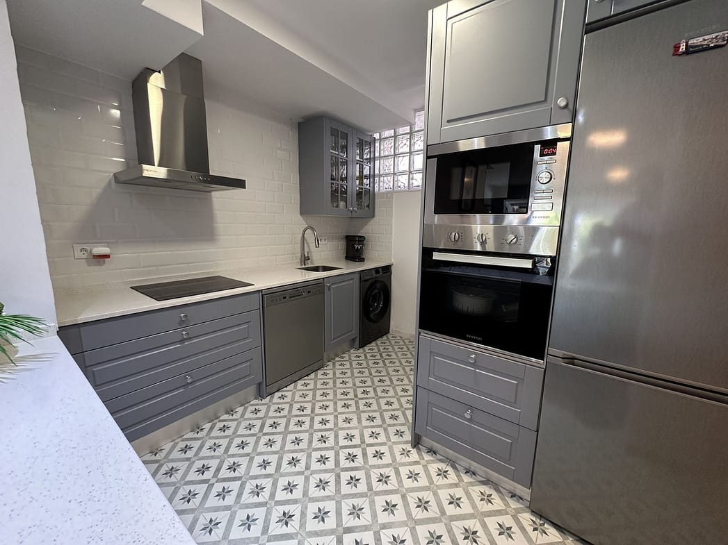 The modern open-plan kitchen has been completely renovated with a contemporary design and high-quality finishes, ready to move in.