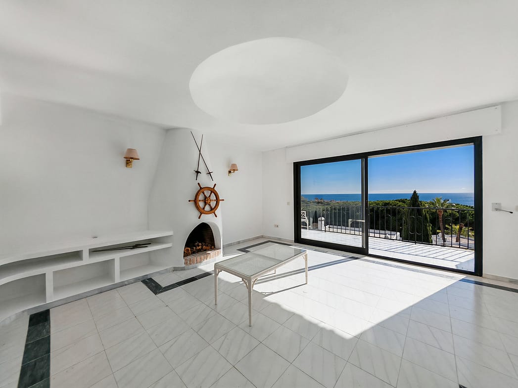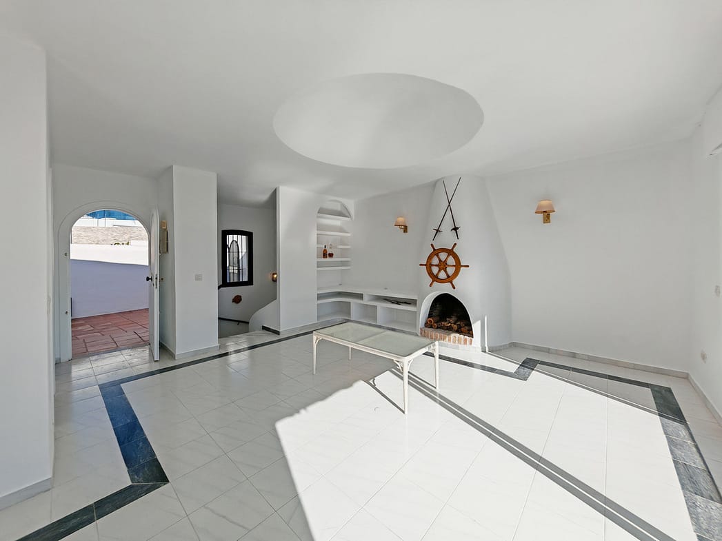 Town House for sale in Cabopino, Marbella with 2 bedrooms, 2 bathrooms, 2 en suite bathrooms and 1 toilet, with communal swimming pool and private garden. Regarding property dimensions, it has 123 m² built, 175 m² plot and 30 m² terrace. Has the following facilities amenities near, air conditioning, fireplace, guest toilet, private terrace, sea view, covered terrace, panoramic view, unfurnished, close to sea / beach, close to golf, uncovered terrace, glass doors, balcony, renovation needed and close to shops.