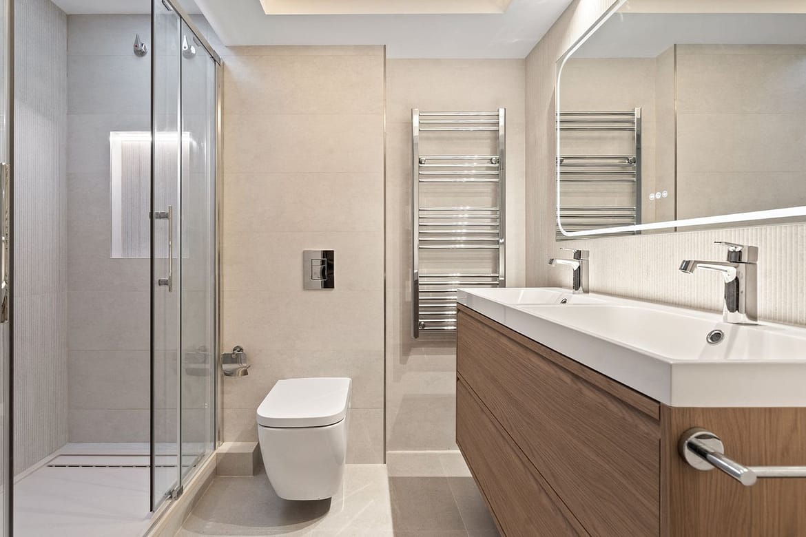 Bathrooms have been resolved with a contemporary and restrained approach, incorporating walk-in showers, refined fittings, and neutral textures. Storage solutions are integrated throughout the property, maintaining visual clarity while offering practical capacity.