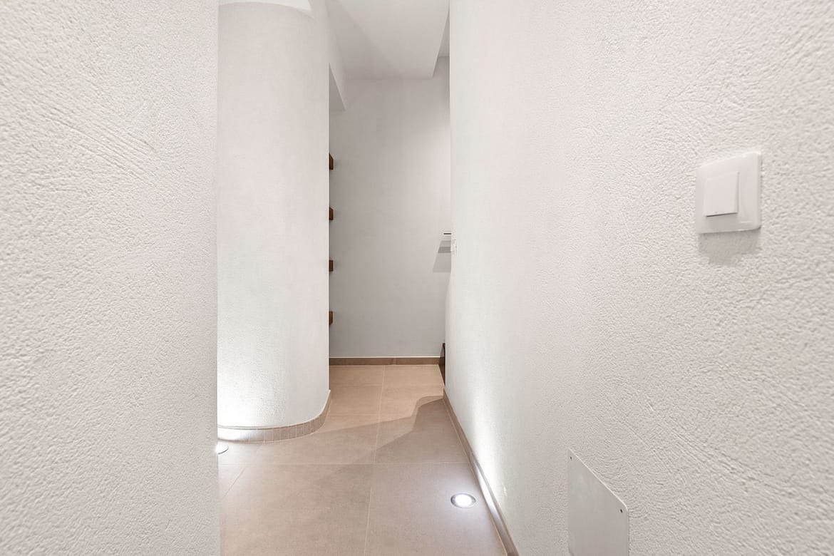 The entrance leads into a calm and well-defined interior where neutral tones and clean lines create a sense of continuity. Flooring, lighting, and carpentry have been carefully selected to enhance proportion and flow, resulting in spaces that feel both practical and understated. Natural wood details introduce warmth and contrast, reinforcing the connection between different levels of the home.