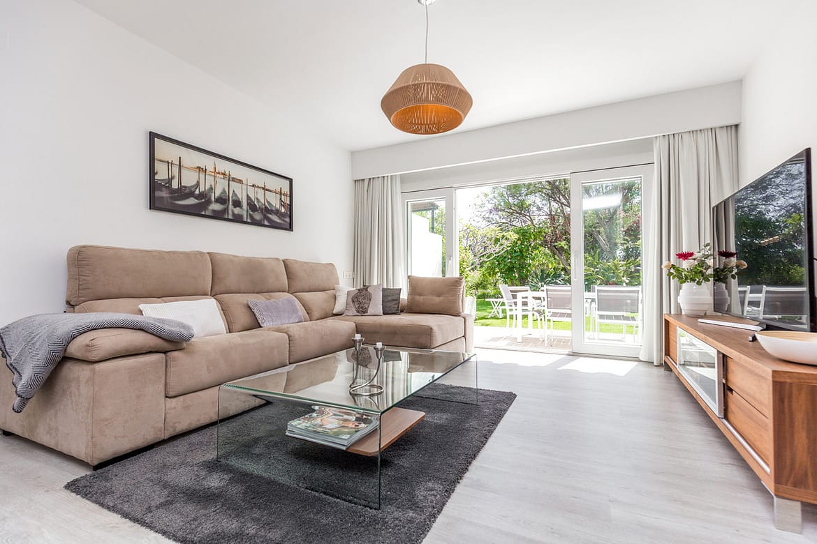 Frontline golf, fully renovated townhouse in Peñablanca, a gated complex by the Aloha Golf Club, Nueva Andalucía, just 3km away from Puerto Banús. Southwest facing and built on 2 levels, property comprises: entrance hall; living/dining room with fireplace and access to the private terrace and garden; open-plan modern kitchen with independent laundry area; 2 bedrooms; 2 bathrooms. A carport for one car. Independent A/C in every room. A fantastic and relaxing golf property just 5 minutes from the beach.