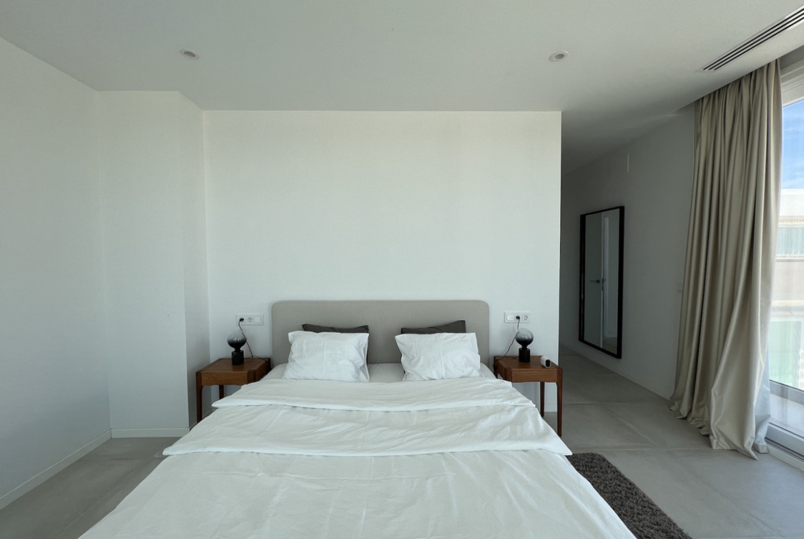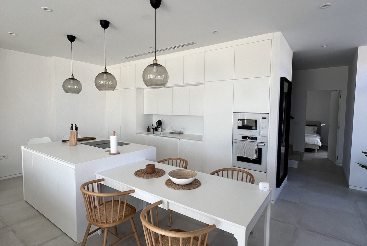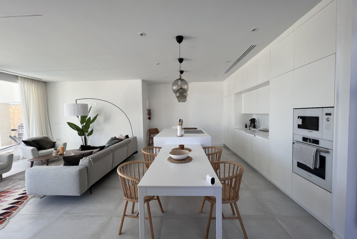 Upon entering the house, consisting of a grand living room, dining area and open plan kitchen, as well as a guest ensuite bedroom. From here one has direct access to both the front southwest facing terrace and the rear patio, which has been featured with an open-air solarium and pool area.