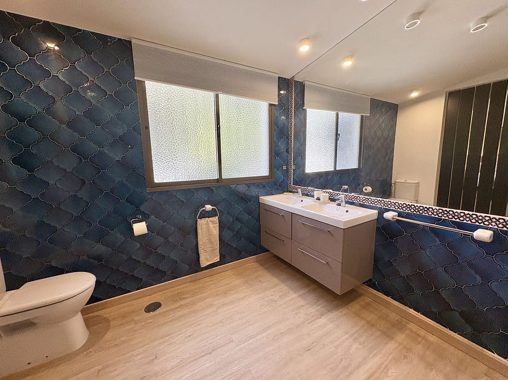 Master bedroom with large fitted wardrobes and a renovated ensuite bathroom with bath and shower – his and hers sinks.