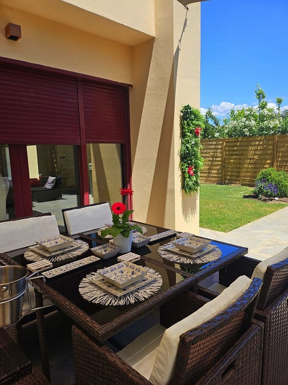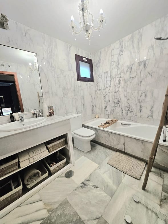Impeccably maintained, this villa features three bedrooms (two with en-suite bathrooms), three bathrooms (two en-suite), an inviting entrance hall, an open-plan living-dining room, and a brand-new fully equipped kitchen with integrated oven, microwave, coffee maker, fridge-freezer, dishwasher, and quartz worktops. Luxurious marble flooring extends throughout, while the expansive outdoor terrace – recently renovated – includes a 5-person jacuzzi for ultimate relaxation. The fully fenced landscaped garden boasts automatic irrigation, ensuring low-maintenance beauty.