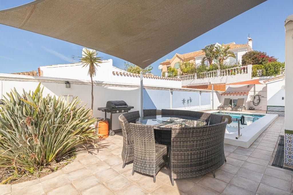 Exterior: Beautiful front garden with very easy maintenance, parking for one vehicle, beautiful pool area with a lot of tranquillity surrounded by sunny terraces with barbecue area and dining table, and store room. Rear patio with storage room and access to the roof terrace with sea views.