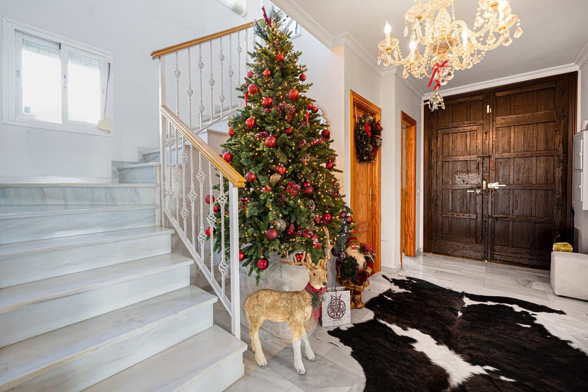 Villa Christine is a spacious south-facing family home set on a generous 900 m² plot in Mijas. The property offers panoramic views of the Mediterranean Sea, the surrounding mountains, and beautifully maintained gardens. Inside, the grand hallway and marble staircase set the tone for this elegant residence. The modern kitchen features sleek black-and-white finishes, an island unit, and a bay window with stunning sea views.