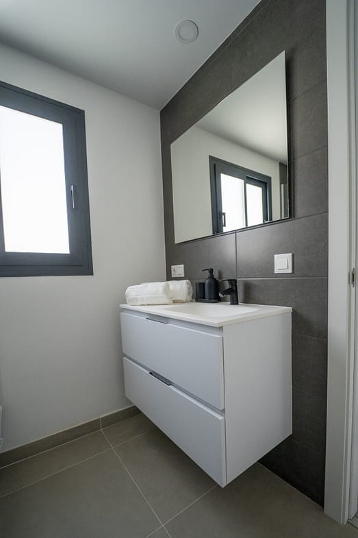 On the first floor, two well-appointed bedrooms provide cozy sleeping arrangements—one with a double bed and the other with two single beds. The top floor is reserved for the master suite, complete with a private bathroom and an exclusive terrace, offering the perfect spot to enjoy quiet moments in the sun.