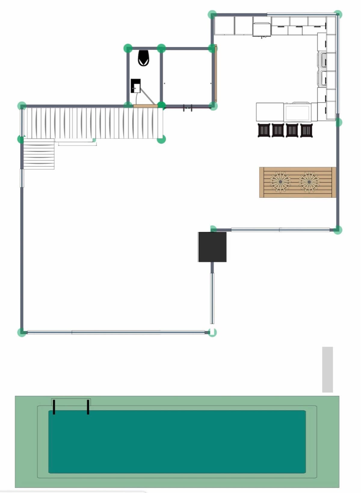 – Infinity pool with reinforced concrete, turquoise natural stone, and a compensation tank.