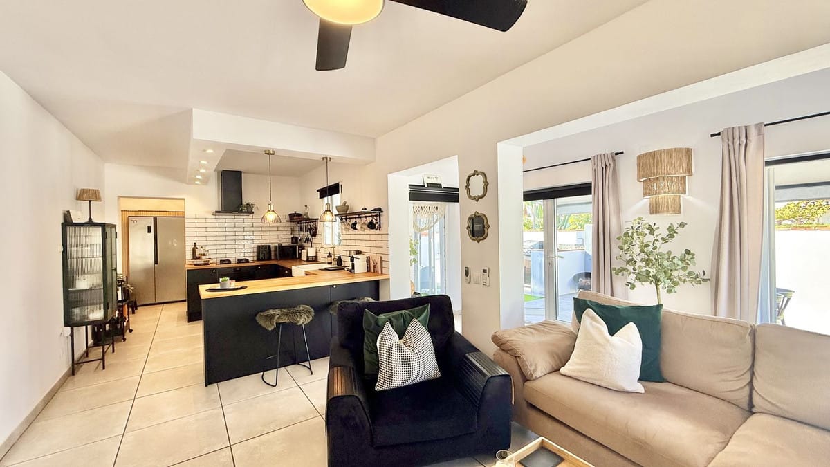 Set on a nearly 300 m² private garden plot, the home is just a short walk to the picturesque El Faro beach,