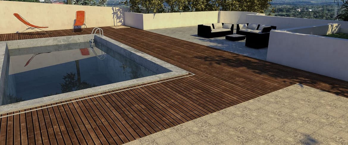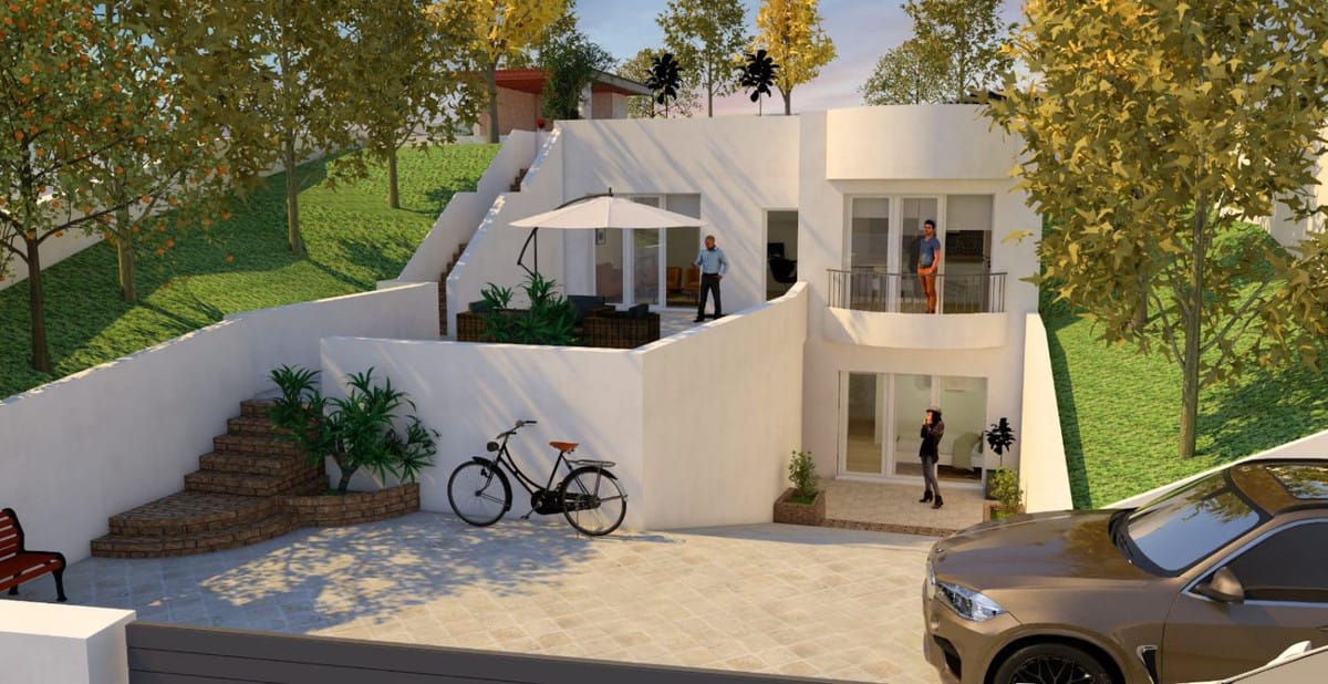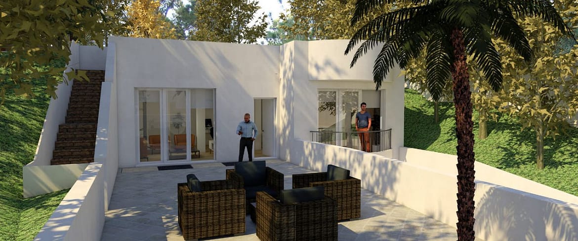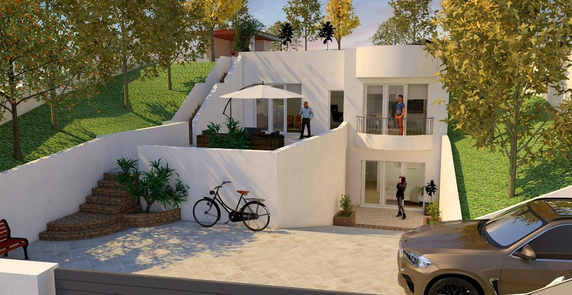 The upper terrace features an English patio, providing natural light to the bedrooms.