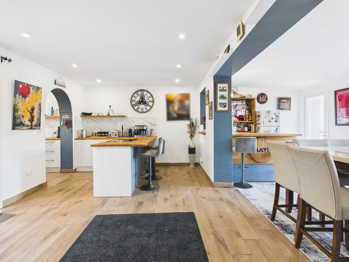 The kitchen has been finished with solid oak worktops, including a stylish bar, adding warmth and character to the home. Air conditioning provides year-round comfort.