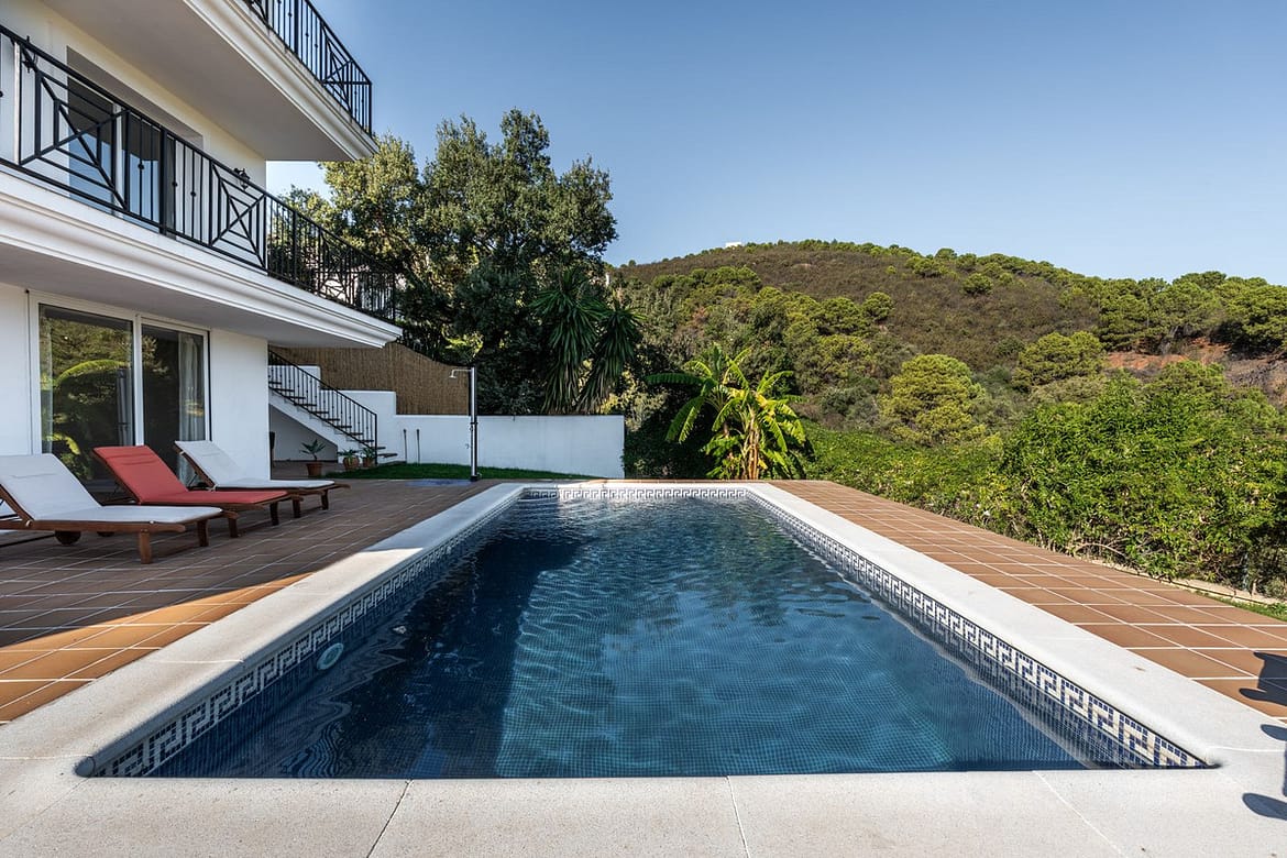 This is a charming three-level home that combines tranquility with convenience. Just a short drive from Estepona town and the beach, this residence is a haven for those who want peace without sacrificing accessibility. Surrounded by greenery, this home offers stunning views of mountains and sea. Step inside to find a well-designed ground level with a modern kitchen, a toilet, a cozy living and dining area leading to a balcony – your perfect spot for a morning coffee. This level becomes ideal entertainment hub, ensuring convenience when hosting friends. With everything you need on the ground floor, there's no need to disrupt the serene bedrooms on the lower levels. On level minus one, discover two bedrooms with terrace access. One with an en-suite bathroom and its own private terrace. Descend to minus two for the master bedroom, complete with a poolside terrace for pure relaxation. Outside, your private oasis awaits with sunbeds, an outdoor shower, and a swimming pool – the ideal escape from city life.