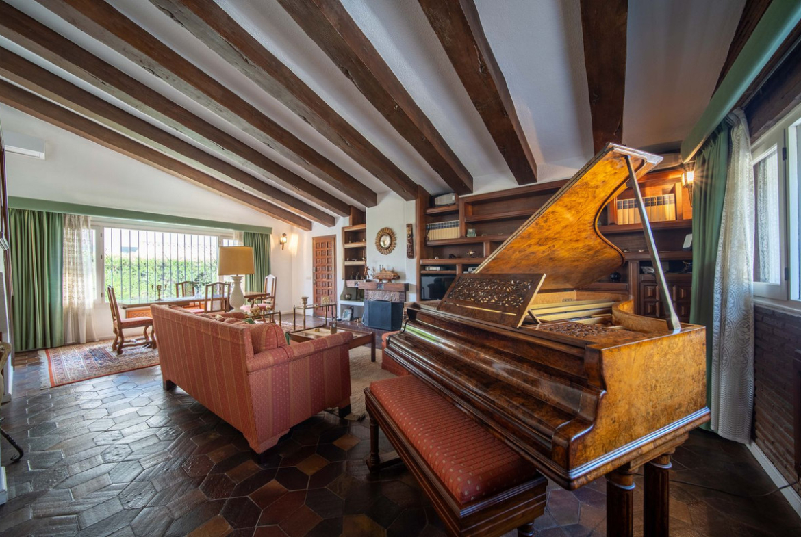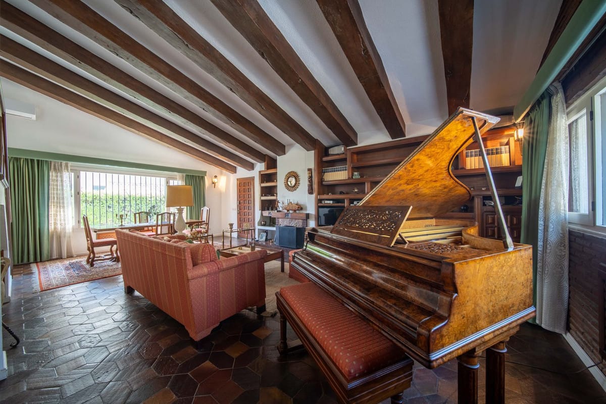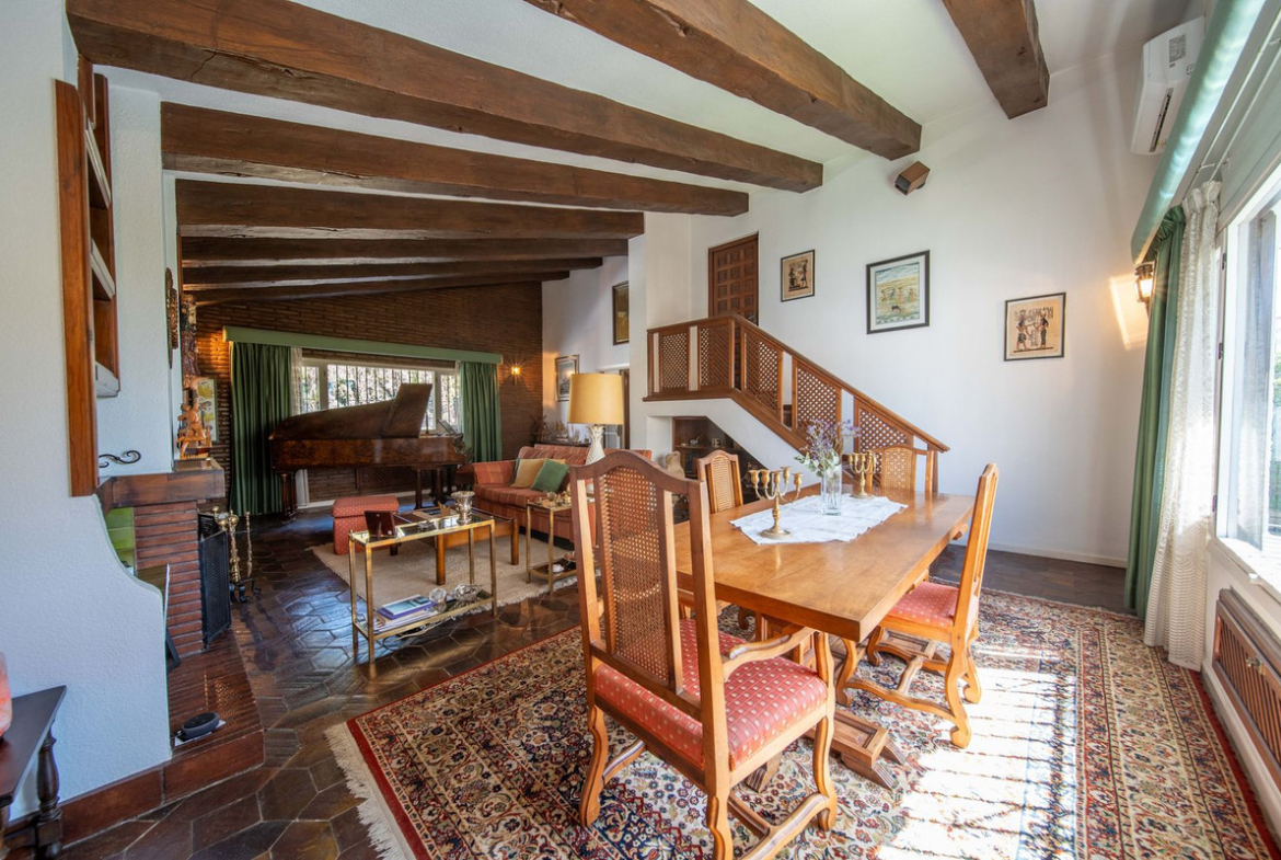 • A spacious living-dining room of over 60 m², featuring a high ceiling with decorative beams, a fireplace, and an elegant hardwood bookcase.