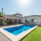 The west-facing plot enjoys all-day sunshine, and the lush Mediterranean garden features mature palm and olive trees, a generous swimming pool, and multiple terraces perfect for outdoor living.
