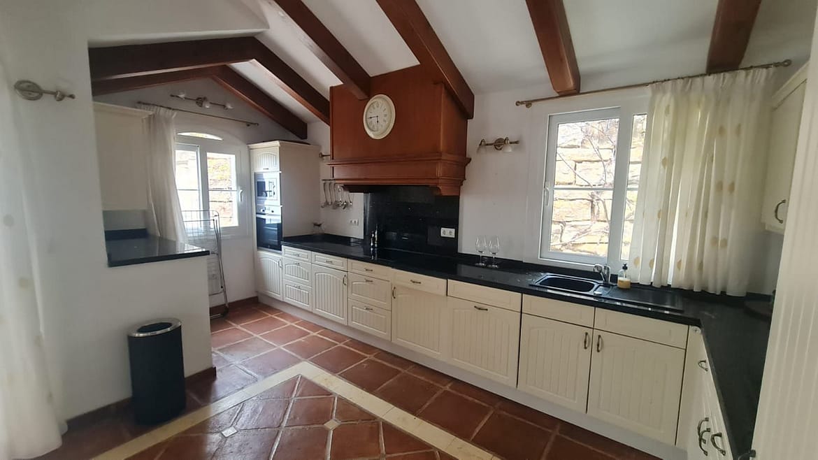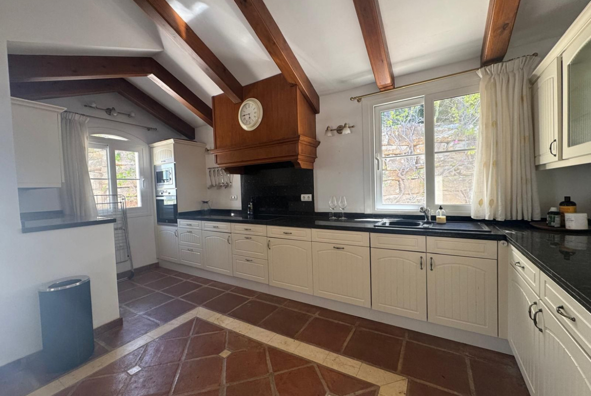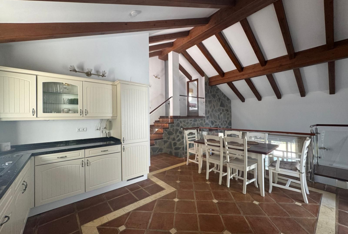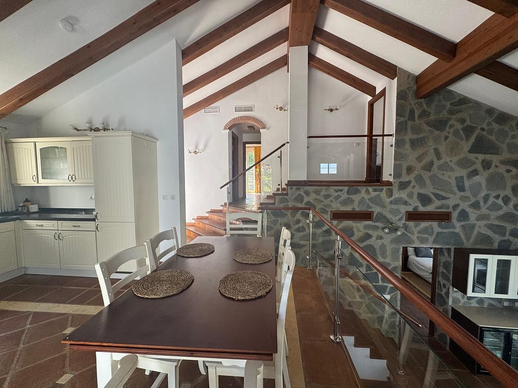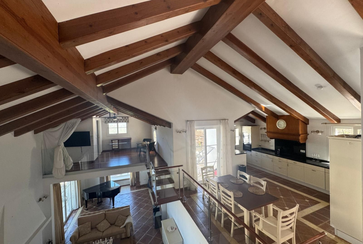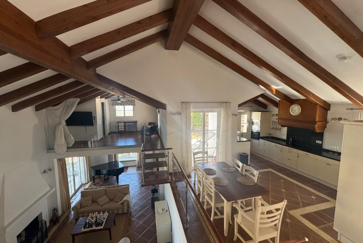 Built in a modern rustic style, the villa is spacious and full of character, with double-height ceilings in the living room that enhance the sense of space and light. A charming mezzanine level, ideal as a home office or potential fourth bedroom (with a nearby shower room), overlooks the lounge. The open-plan kitchen and dining area are located on the entry level, creating a welcoming hub for family and guests.