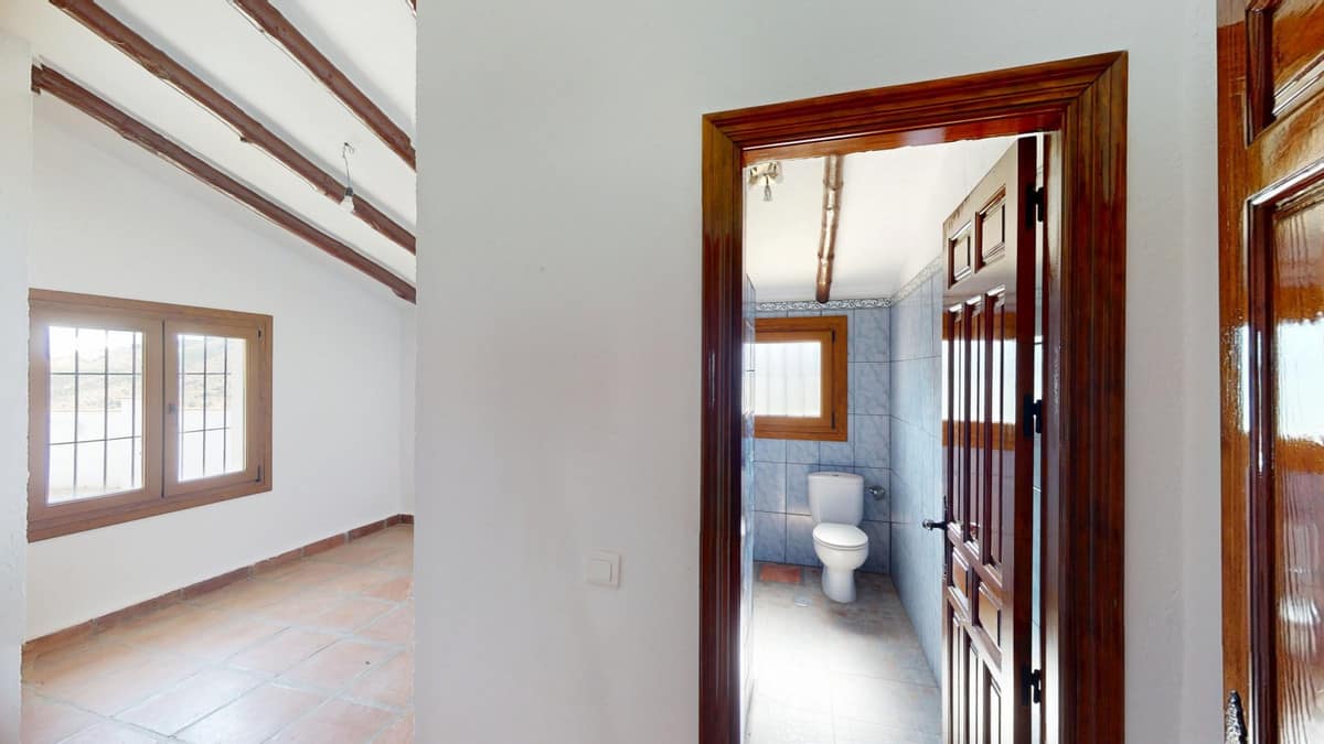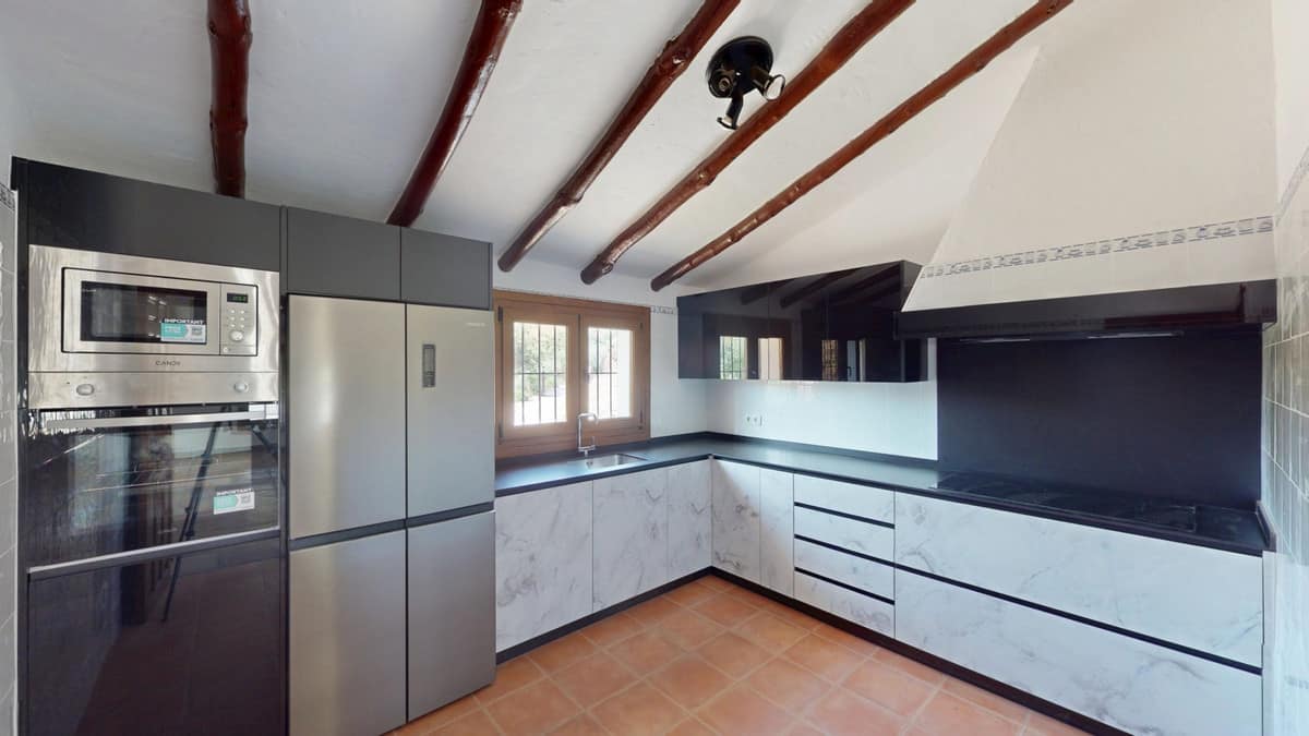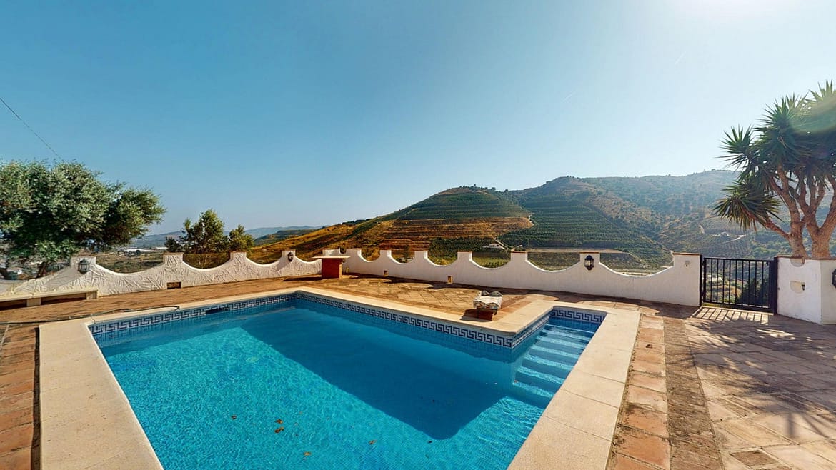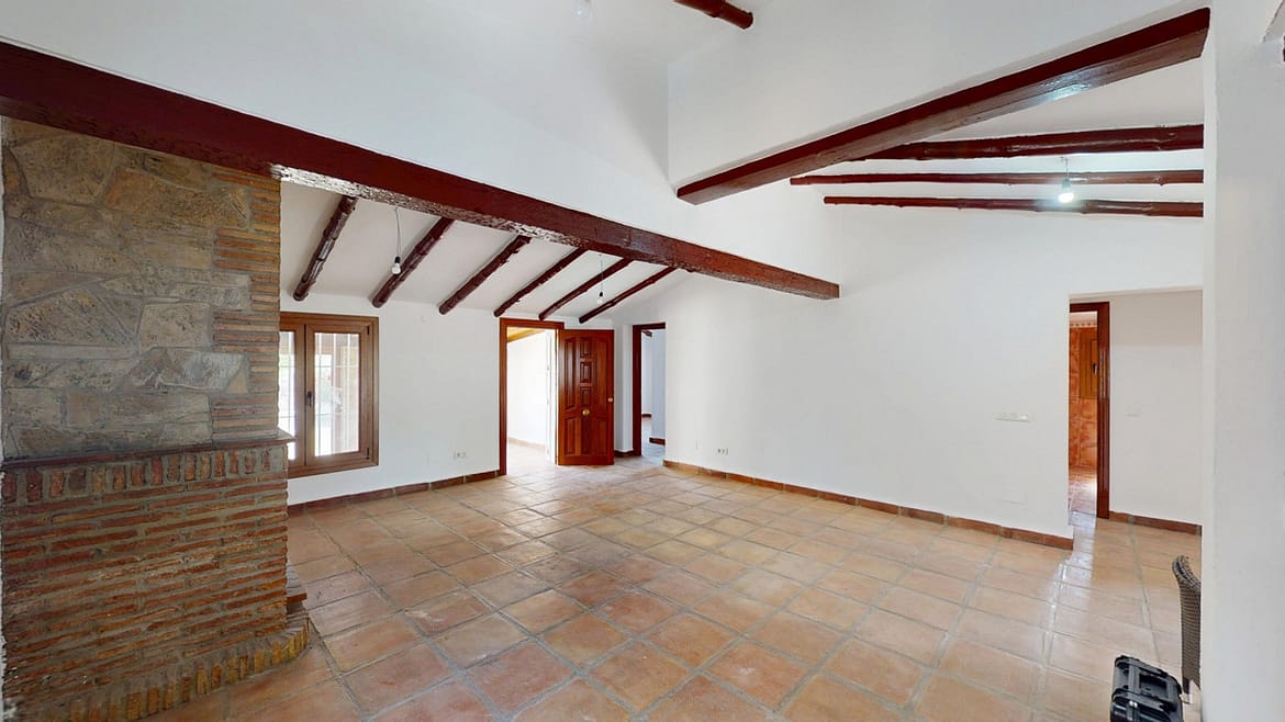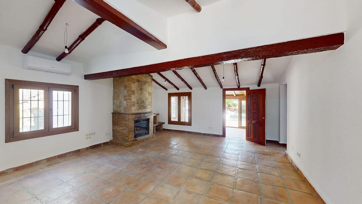 This delightful Spanish villa, located in Viñuela, Málaga, offers a perfect blend of traditional charm and modern comfort. The single-story property spans 167 m2 and features three bedrooms, including a spacious 13.9 m2 primary bedroom, and two bathrooms. Upon entering, you're greeted by the home's most striking feature: beautiful terracotta tile flooring that runs throughout, creating a cohesive and authentic Spanish ambiance. The living areas are characterized by their high, sloping ceilings with exposed wooden beams, adding rustic charm and visual interest to the space. The heart of the home is undoubtedly the living room, which boasts a magnificent stone fireplace as its centerpiece. Large windows and glass doors in this area, as well as in the bedrooms, allow ample natural light to flood the interiors while offering picturesque views of the surrounding landscape. The kitchen presents a harmonious blend of traditional and contemporary design. Modern appliances and sleek cabinetry are juxtaposed against the rustic ceiling beams, creating a functional yet aesthetically pleasing culinary space. The bathrooms, while not extensively detailed in the images, appear to have been updated with modern fixtures. Storage is thoughtfully incorporated throughout the home, with built-in wooden wardrobes in the bedrooms that maintain the overall rustic aesthetic. The property also features two patios, offering delightful outdoor spaces for relaxation and entertainment. A unique aspect of this villa is its attention to decorative details, such as the ornate tile borders in the hallways and bathrooms, which add a touch of traditional Spanish flair to the otherwise simple and elegant interiors. Outside, the villa boasts a beautiful pool and a charming outdoor area perfect for enjoying the Mediterranean climate. Overall, this Málaga villa offers a warm, inviting atmosphere that beautifully marries traditional Spanish architectural elements with modern comforts, creating a truly special living space. We are pleased to be able to present this dream property to you soon, either personally or via virtual viewing. Because this world is unique – just like our Axarquía. In Andalusia. On the Costa del Sol. Here, on the sunny side of life…