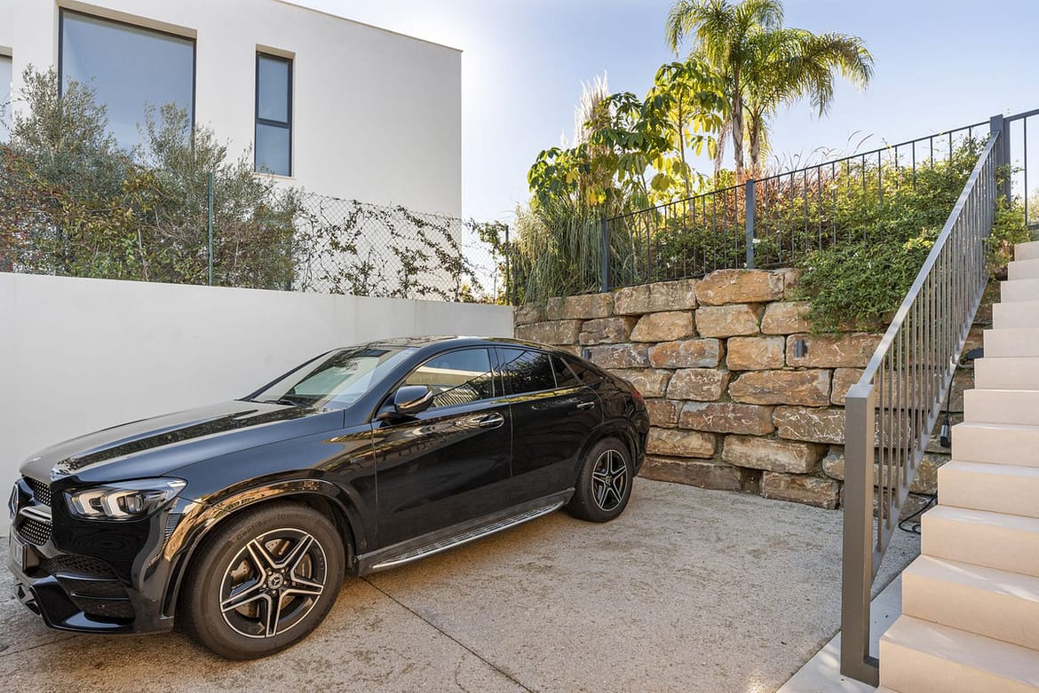 The gated 2-car driveway is located under the garden level, so the cars are safely parked, but out of sight from the garden for maximal enjoyment of the view.
