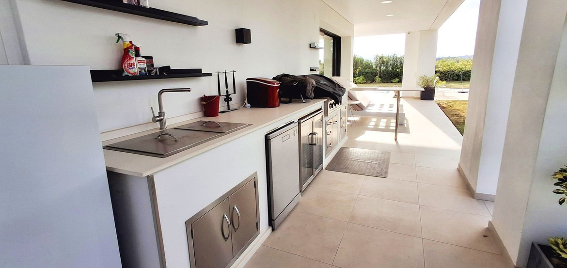 One of the highlights of this villa is the outdoor kitchen, fully equipped with barbecue, grill and cooking and cooling areas, perfect for preparing and enjoying meals outdoors during the mild Mediterranean evenings.