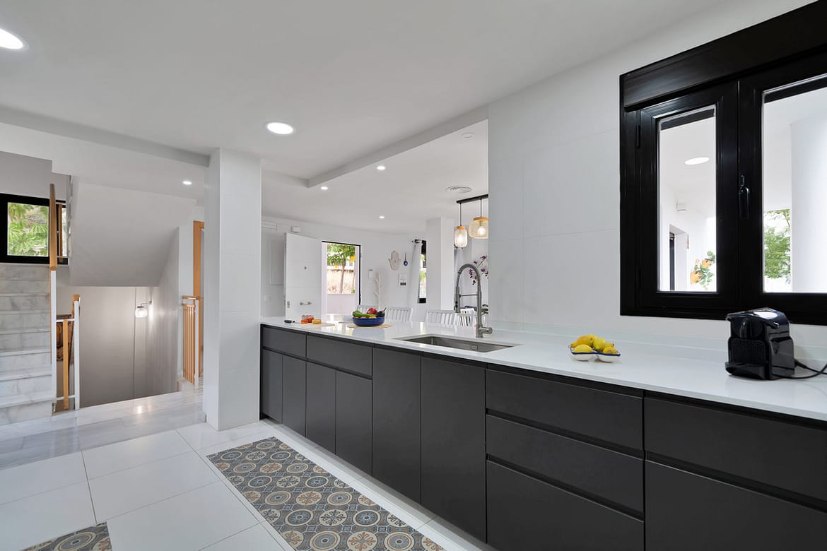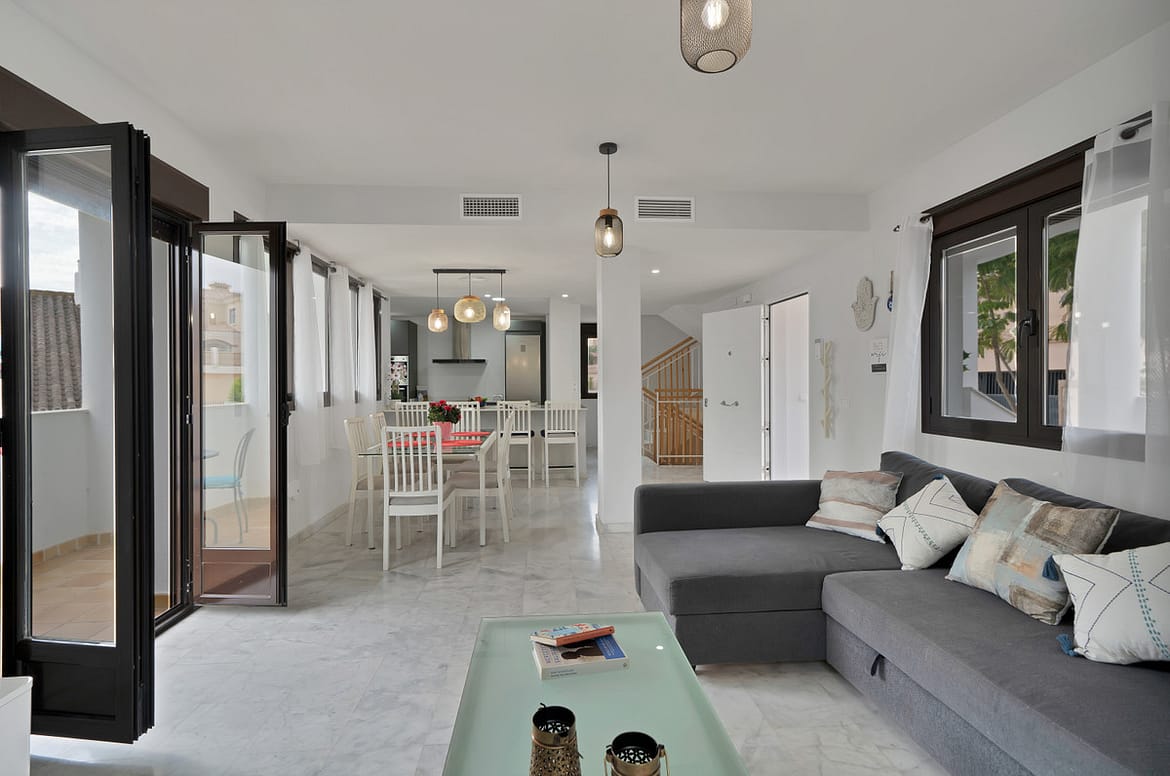 2 Living rooms, a spacious modern kitchen, 3 large bedrooms, 2 bathrooms, 1 guest toilet, laundry room, large solarium, garage, garden, and bright open spaces.