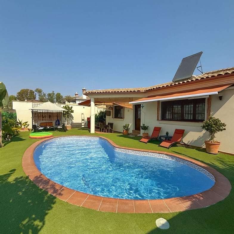 The villa features a private swimming pool, completely renovated with top-quality materials, perfect for enjoying outdoor living and the Costa del Sol climate. The exterior areas are thoughtfully designed to offer both sunny and shaded spaces all year round.