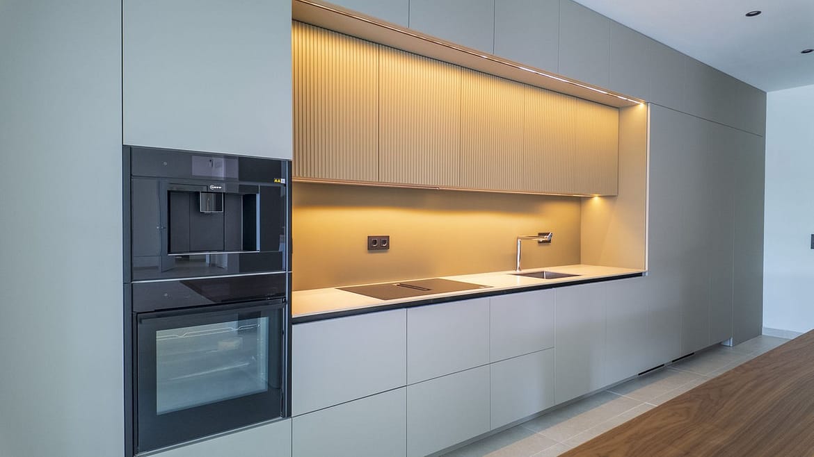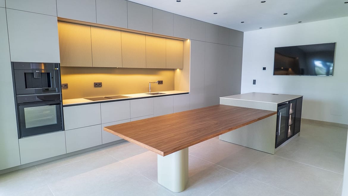The modern kitchen is designed with the latest trends in mind and is equipped with a built-in two-door refrigerator, a wine cooler, and a cooktop with an integrated extractor, making it both aesthetically pleasing and highly functional.