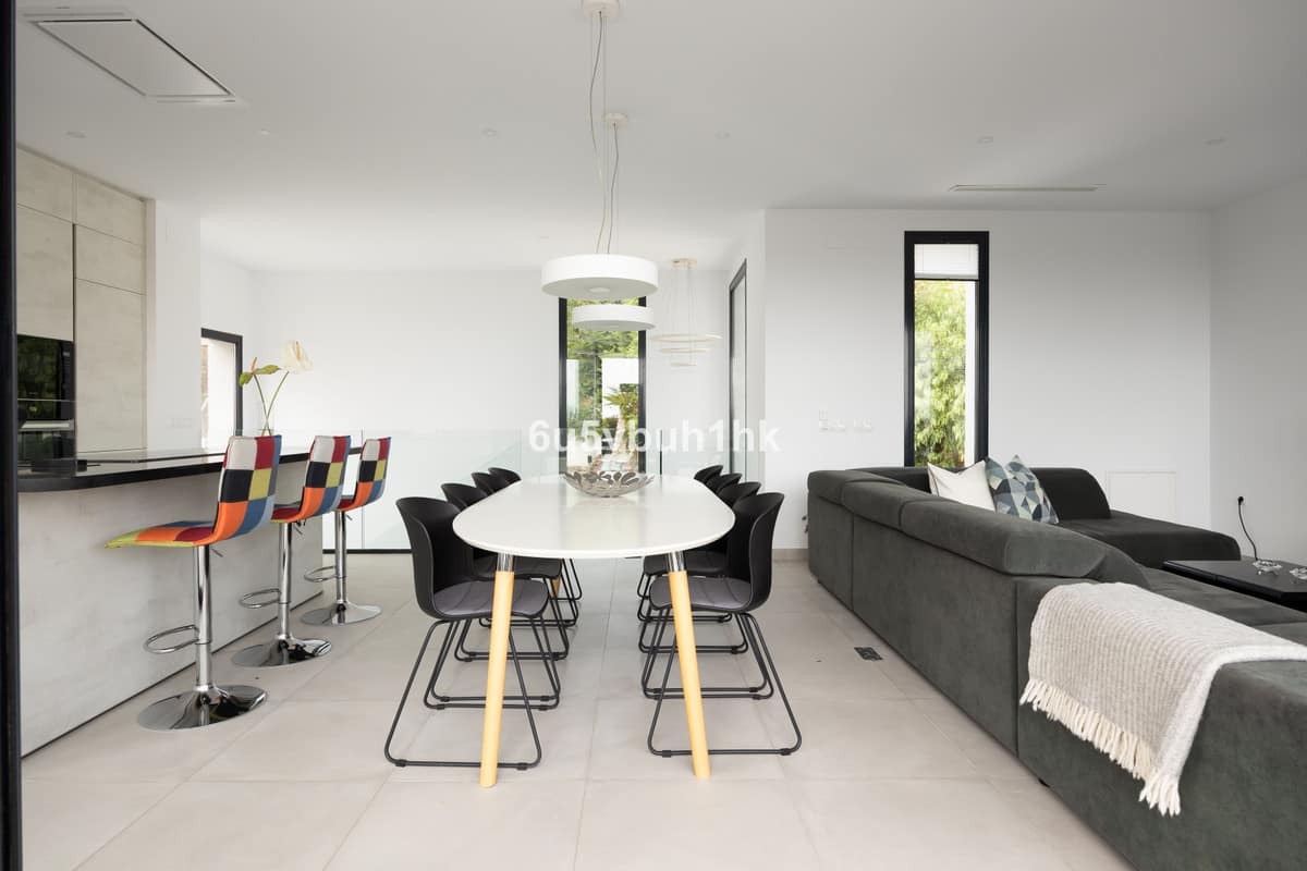 On the ground floor, you will find three spacious bedrooms, all with direct access to the terrace and pool area. The master bedroom features a luxurious en-suite bathroom and a generous walk-in closet. The upper floor impresses with an open-plan design, a state-of-the-art kitchen of the highest standard, and a bright living room. From here, you can access the large terrace, perfect for social gatherings with a dining area, lounge space, and barbecue, as well as partial sea views.