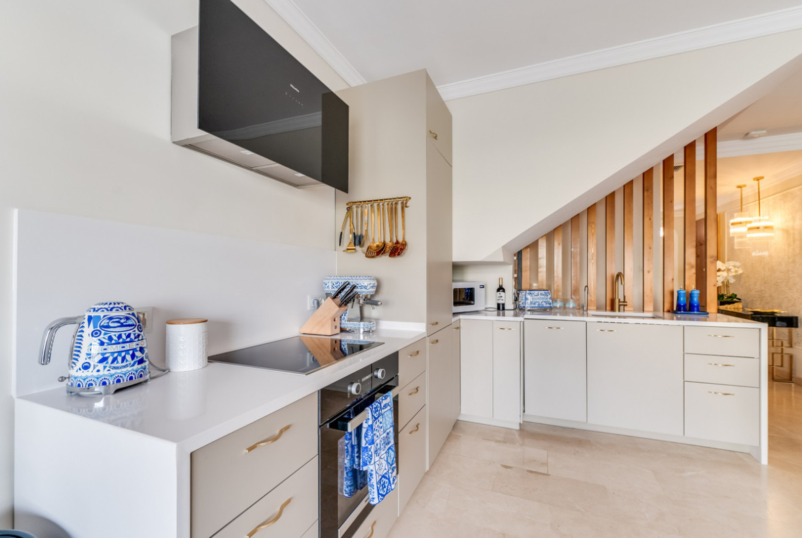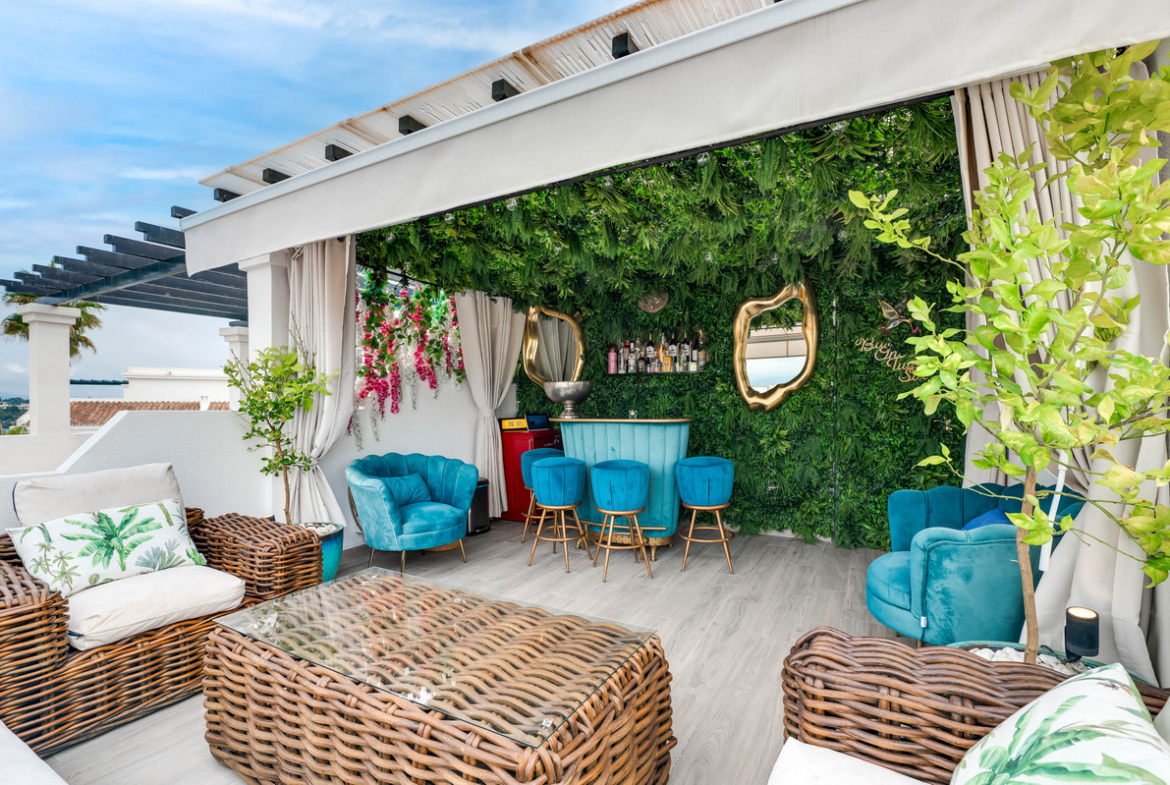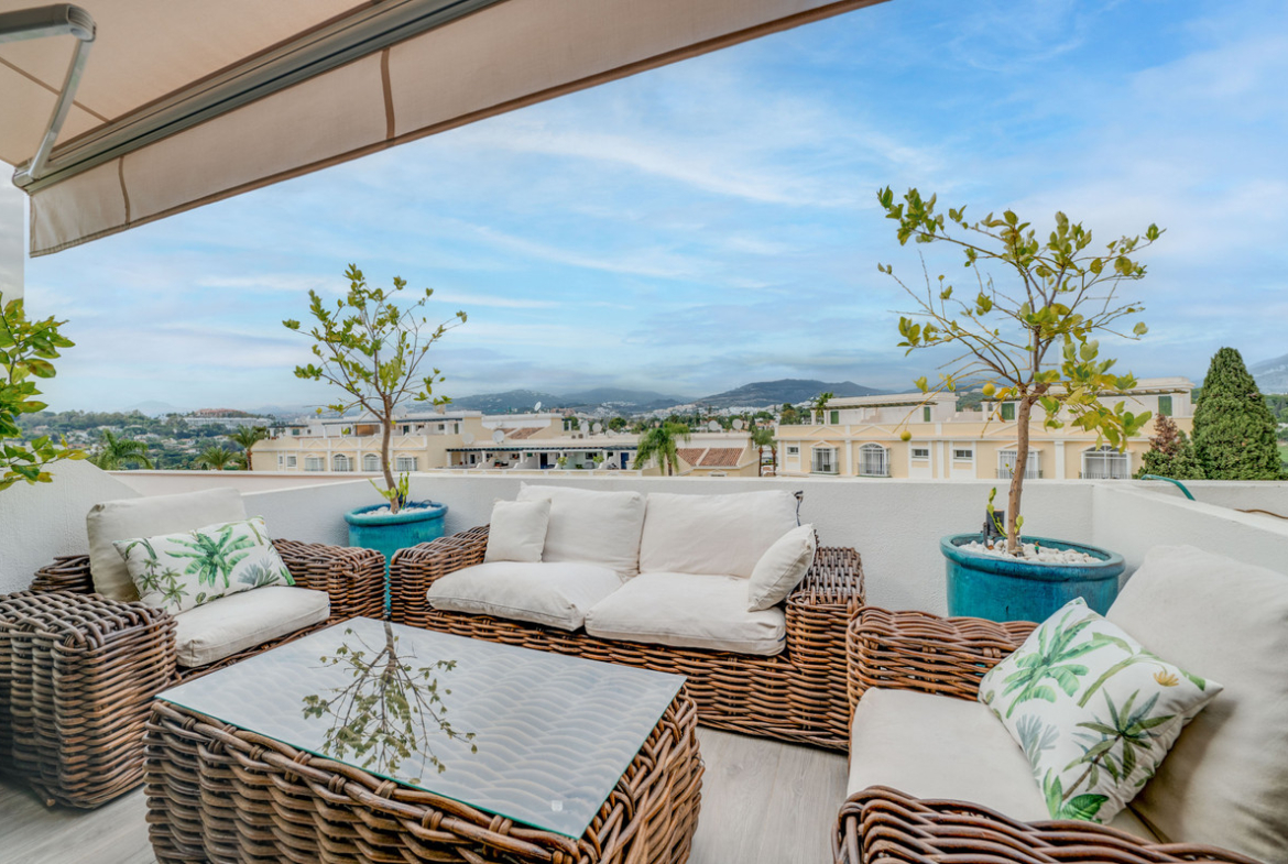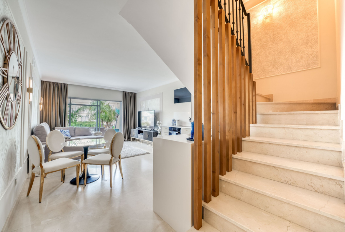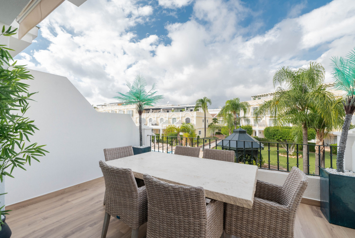 This renovated 3-bedroom duplex apartment in the prestigious Aloha Gardens, Nueva Andalucía, offers stylish and comfortable living. The open-plan kitchen flows seamlessly into the dining and living areas, with the living room opening to a second terrace ideal for outdoor dining or relaxing.